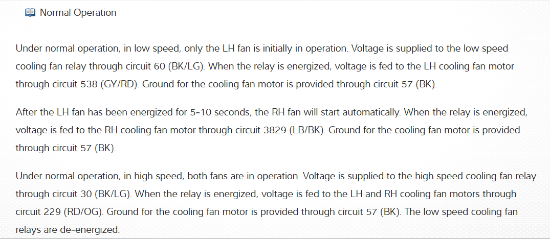 Hello, great site here guys! It is a hybrid two point three liter. I am having an issue with both cooling fans. I have checked so far the fuses and associated relays. I believe I am not getting power out to both the fan motor connectors from relay bank near passenger front by radiator. But I can apply power to both fans and actuate both motors. That doesn’t mean I haven’t made a mistake along the way as this is a complicated system to me. Can you explain how the system functions with the what sensor and A/C on? And what I should be checking how and when? Thanks. With A/C on also, no fans working.