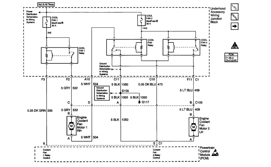 Hi. On my van (similar to the Venture), the cooling fans are not operating properly. (Causing the engine to run hot in the summer, especially in stop and go traffic.) The driver side fan does not come on ever, and the passenger side fan comes on only after the vehicle reaches very high temperatures (above 260 or so) or when the A/C is on. Over the past year, I have changed the coolant temperature sensor and the thermostat (twice actually). I know that both cooling fan motors work, as they come on when directly connected to the battery. I have changed all three relays, and the fan fuses appear good. Of note, when I disconnect the temperature sensor (with engine running), only the passenger side fan comes on (the driver side fan does not). I did detect what appears to be modest heat stress, slight melting at the end of one of the wiring harness connectors, at the junction with the fan assembly. I suspect a wiring issue, but how do I test for that? (And please do not tell me I can only do so with a pro scan tool)