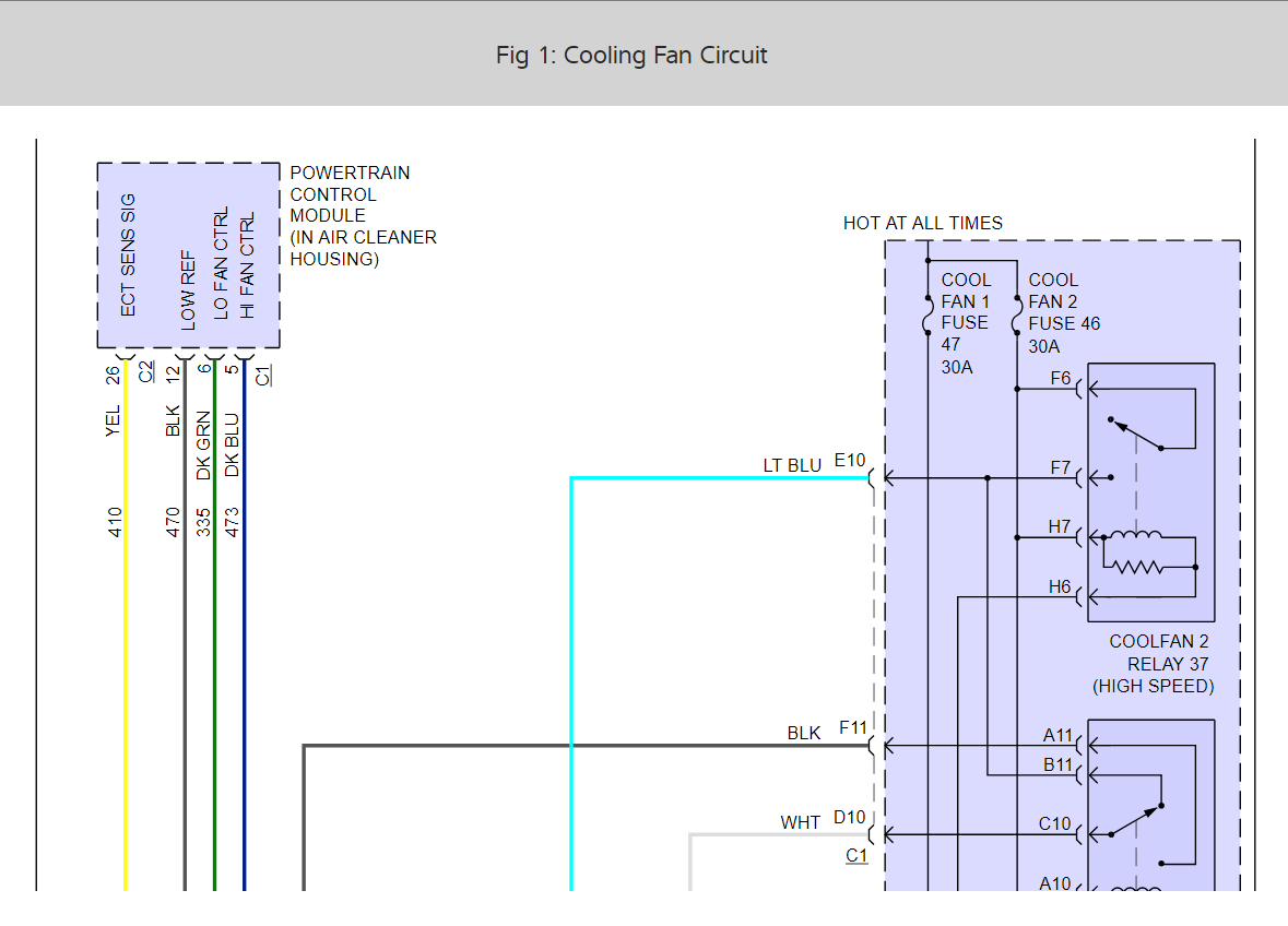 This could be a problem with one of your vehicle's cooling fan relays. A relay is nothing more than an electromagnetic switch that can be broken down into two sides, The control side and the power side. The control side consists of an electromagnet. It has two pins with one wire going to ground and the other wire going to a switched power source, in your vehicle's case the Power-train Control Module (PCM) AKA, "computer". The power side consists of a switch. It also has two pins. One wire is connected to a fused constant battery voltage source, in your vehicle's case fuse 46 and 47 respectively, and the other wire is going to the positive pin on the connector of what is wanting to be powered, in this case the cooling fan. When the PCM commands the fan on it sends electricity to the control side, energizing the electromagnet. The electromagnet then pulls the switch closed allowing battery voltage to the fan, making it run.