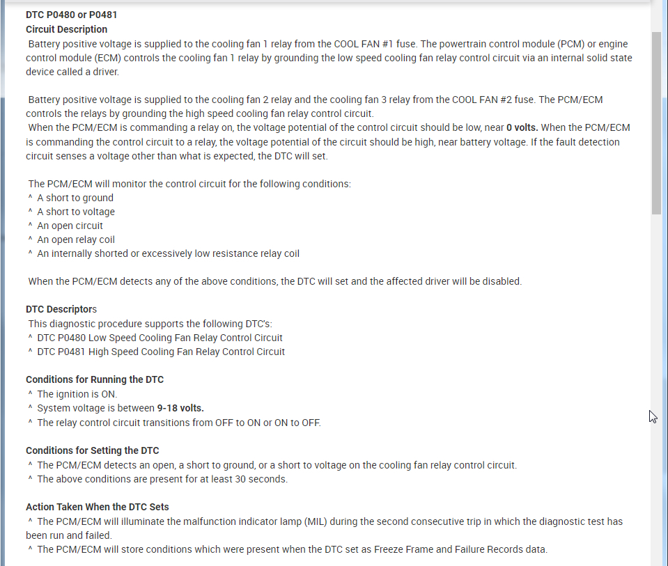I have a p0481 code on my vehicle and have reset it and it keeps coming back. I check the relays, wiring, and fans and they all work as they should. The motor was change about 2 months ago. I heard that there needs to be refrigerant in the compressor for the cooling fans to run but I don't know if that's true. I also don't think it's the temperature sensor because it works on the dashboard. Any help would be appreciated.