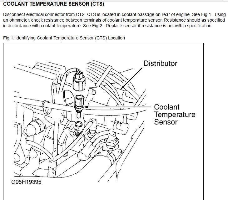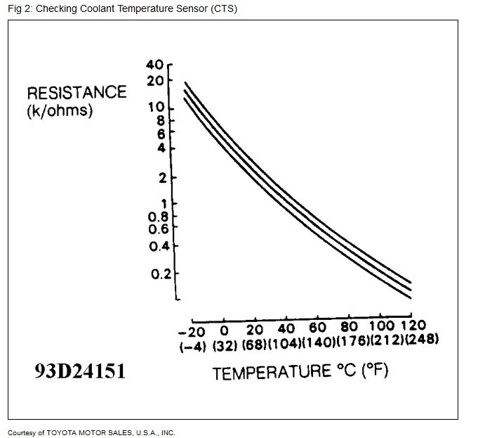 I am attaching Toyota's instructions on how to test the coolant temperature sensor in the images below. You will need a multi-meter or ohmmeter for this. A decent multi-meter can be bought for $15.00 to $20.00 (last I checked, at least). You will need to set it to Ohms and go from there as outlined below.