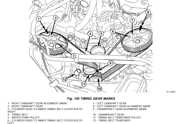 Rotate crankshaft sprocket 2 revolutions and check the timing marks on the camshafts and crankshaft. The marks should line up within their respective locations (Fig. 150). If marks do not line up, repeat procedure.