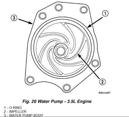 NOTE: It is normal for the water pump to weep a small amount of coolant from the weep hole (black stain on water pump body). Do not replace the water pump if this condition exists. Replace the water pump if a heavy deposit or a steady flow of engine coolant is evident on water pump body. This indicates a shaft seal failure and pump must be replaced. Be sure to perform a thorough analysis before replacing water pump.