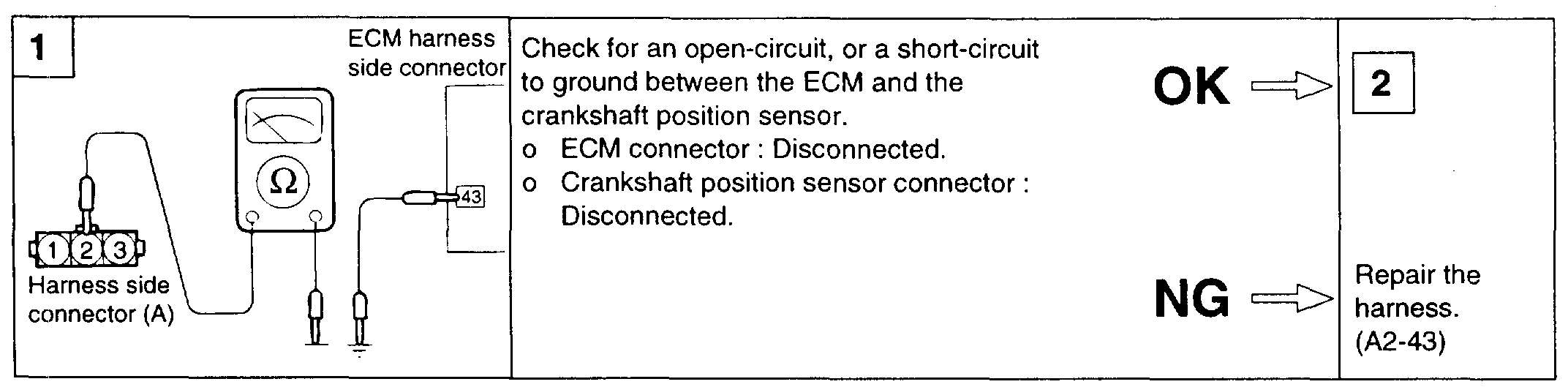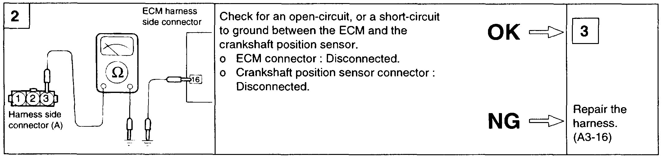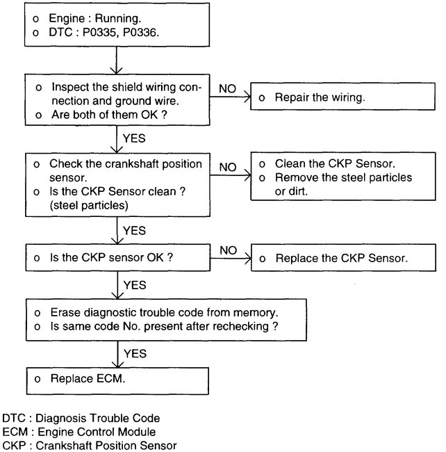 1. If unexpected misses are felt during driving or the engine stalls suddenly, shake the crankshaft position sensor harness. If this causes the engine to stall, check for poor contact at the sensor connector.