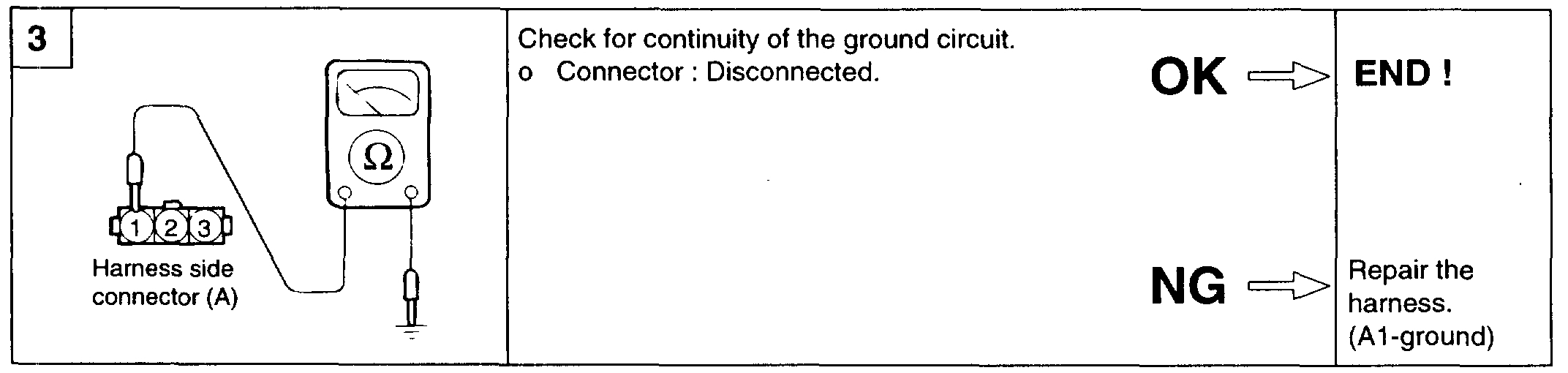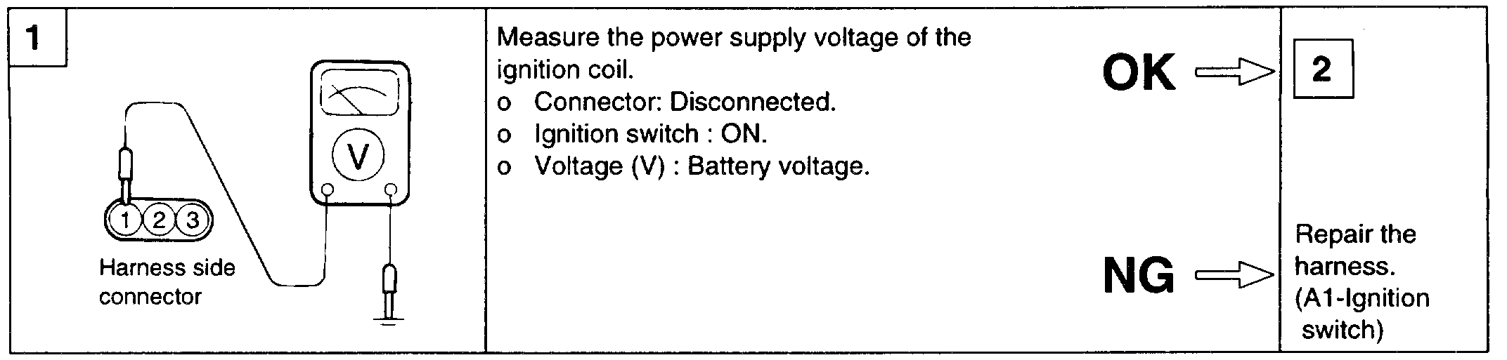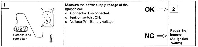 1. Measure the resistance between connector terminals 3 and 2 (the coils at the No.1 and No.4 cylinder sides) of the ignition coil, and between terminals 3 and 1 (the coils at the No.2 and No.3 cylinder sides).