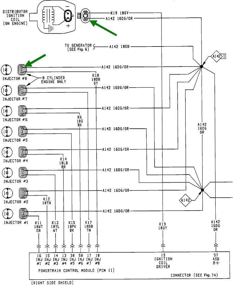 The next test it to check for 12 volts coming from the automatic shutdown, (ASD) relay. The easiest way to see if the circuit is working is to measure the voltage on the dark green / orange wire at the ignition coil or any injector. I prefer to use a test light so I can see it from inside the truck. Also, most digital voltmeters don't respond fast enough.