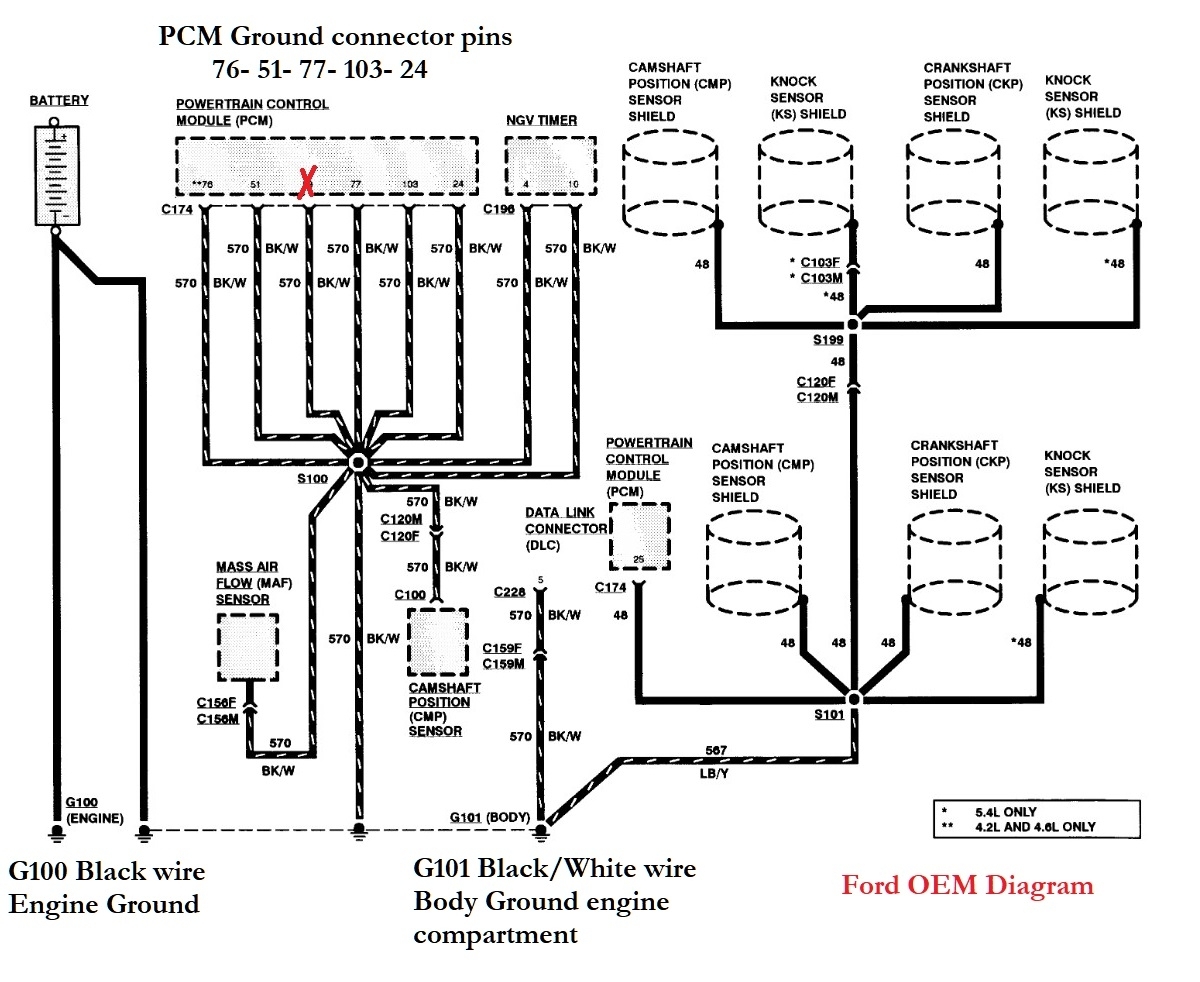 Sorry for the delay, some of the aftermarket diagrams were incorrect, so these are the OEM Ford diagrams. Diagram 1, 2 are the PCM ground locations.