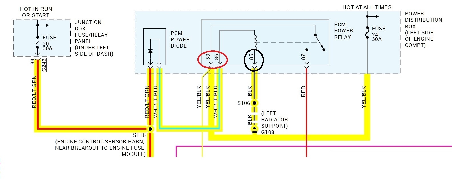 Diagram 6 is for the PCM power relay, if you take the relay out of its location, out of the 4 pins where the relay sits, 2 pins should have power at all times, and 1 pin should go directly to ground. So, if you use a multimeter to check for power here, just touch the pins lightly without pushing the meter leads into the pins, that will spread the pins and the relay will not make good contact afterwards.