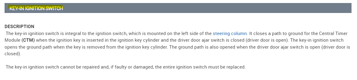 Ok the way they word this is a little confusing, But the key in sense closes a path to ground for whatever this Central Timer Module is, so it looks like pin 5 should create a Ground when the key is inserted, the service info here states something about the driver's door being open, but it doesn't really make a lot of sense as to what they are doing with the door switch. For testing purposes, I would try to tape the driver door switch closed so it's not messing with testing the Ignition switch. With the way that was overheated. I would be surprised if it's not damaged. But try getting the door switch to stay closed while checking that. I'm going to dig around for more info on the operation of this circuit.
