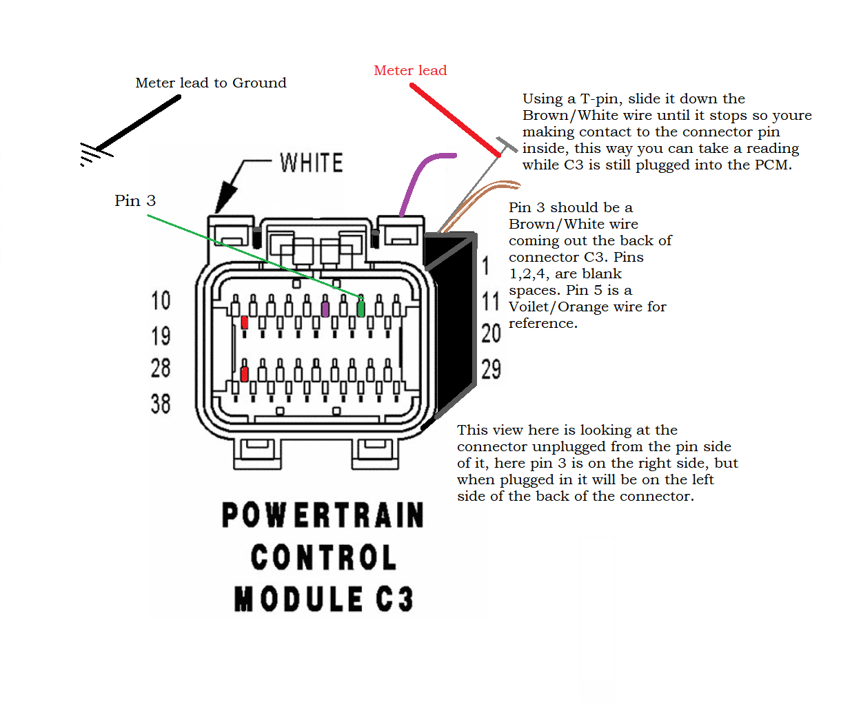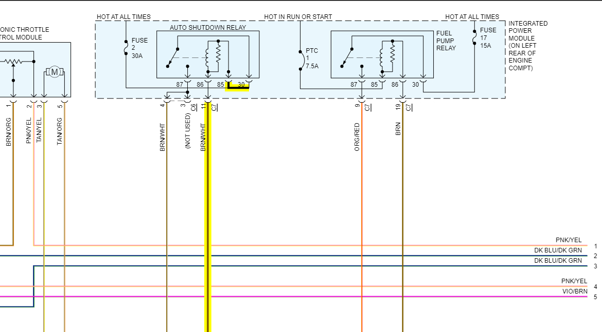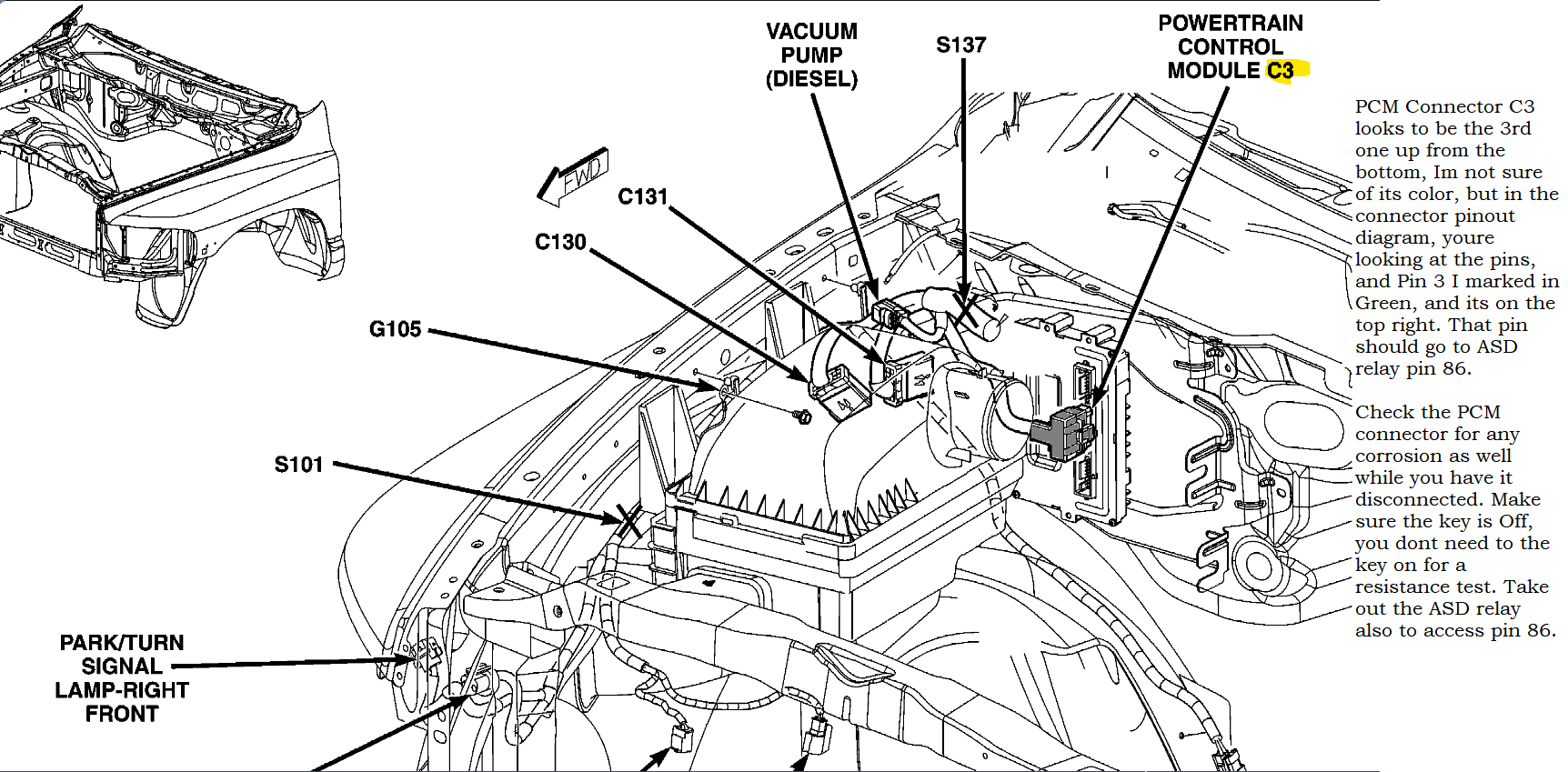 If all that checks out ok, then we need to go directly to the PCM connector C3 pin 3 and see if the PCM is giving the ASD relay ground. If it is, then there is an open circuit between the PCM and the ASD relay Ground for pin 86.