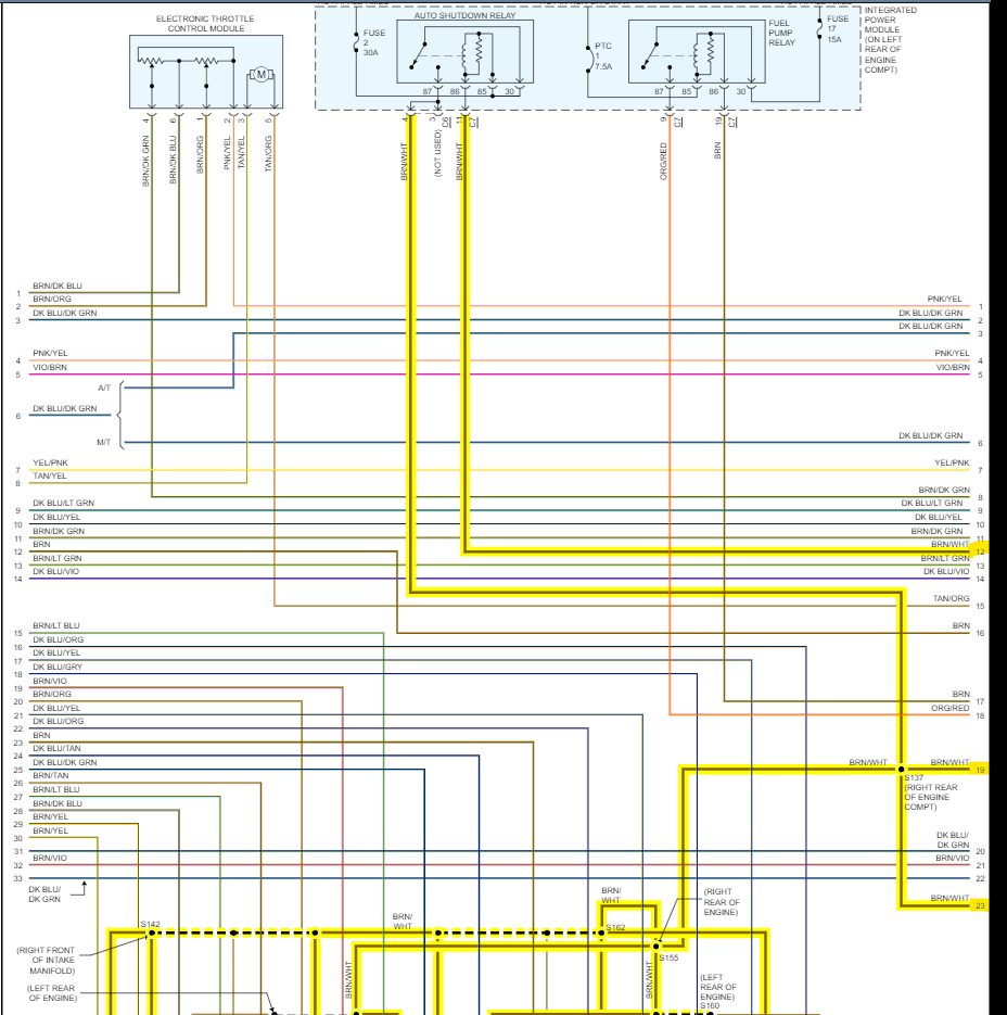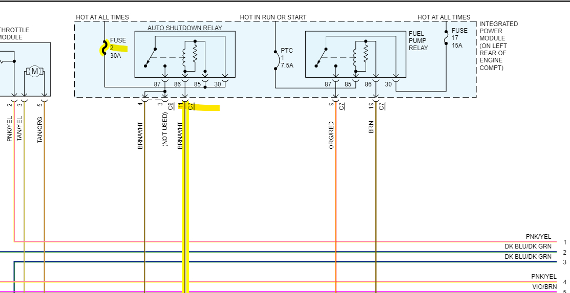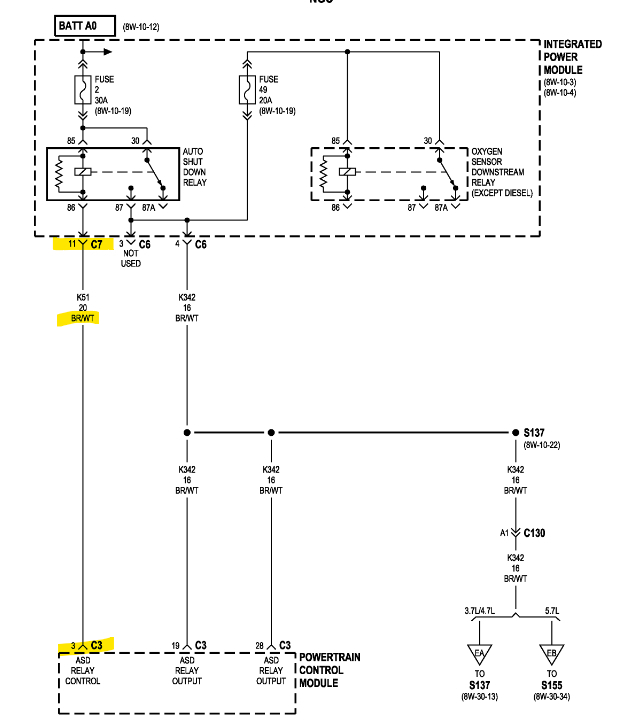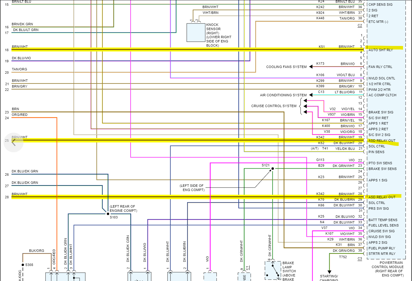 But the brown/white wire coming out the back of that white PCM connector is the ASD relay control wire, there are other brown/white wires coming out of that connector, unfortunately I don't know why manufacturers do that, but if you can remove the back cover on the PCM white connector, you can find pin 3 and try to follow that wire. The 2nd diagram is the OEM manufacturer diagram, it shows there are no connectors in between, so the first thing I would do is check underneath the relay/fuse box for any broken off wires, you can check continuity from pin 86 to under the relay box to find the correct pin. If it's not broken there, you'll have to follow that Brown/White wire from either the relay or the PCM pin 3. Follow the harness around and check any contact points where the harness is attached to brackets or areas where the harness is exposed.