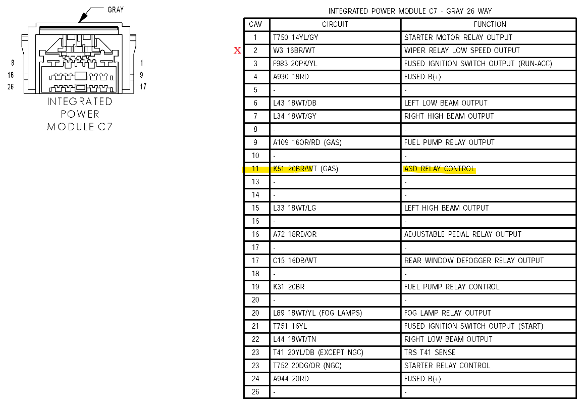 So, with your ASD relay to the PCM test, your meter is on a 20 million Ohm scale, so there is 1.6 million ohms of resistance on that circuit, that's an open/corroded circuit between the relay and PCM connector. The yellow connector I posted back a few, that's an air bag connector for the steering wheel airbag. You shouldn't have unplugged that with the battery still hooked up, I'm surprised the airbag didn't go off. But that's probably because the connector fell apart. But don't mess with that anymore. That needs to be repaired by a tech that is comfortable doing airbag SRS work. I'm not going to advise on that except to say that its very dangerous and if it goes off in your face you can get seriously hurt. So, leave that yellow connector out if the internal parts of the connector fell out. This is the diagram I posted on the last page about that.