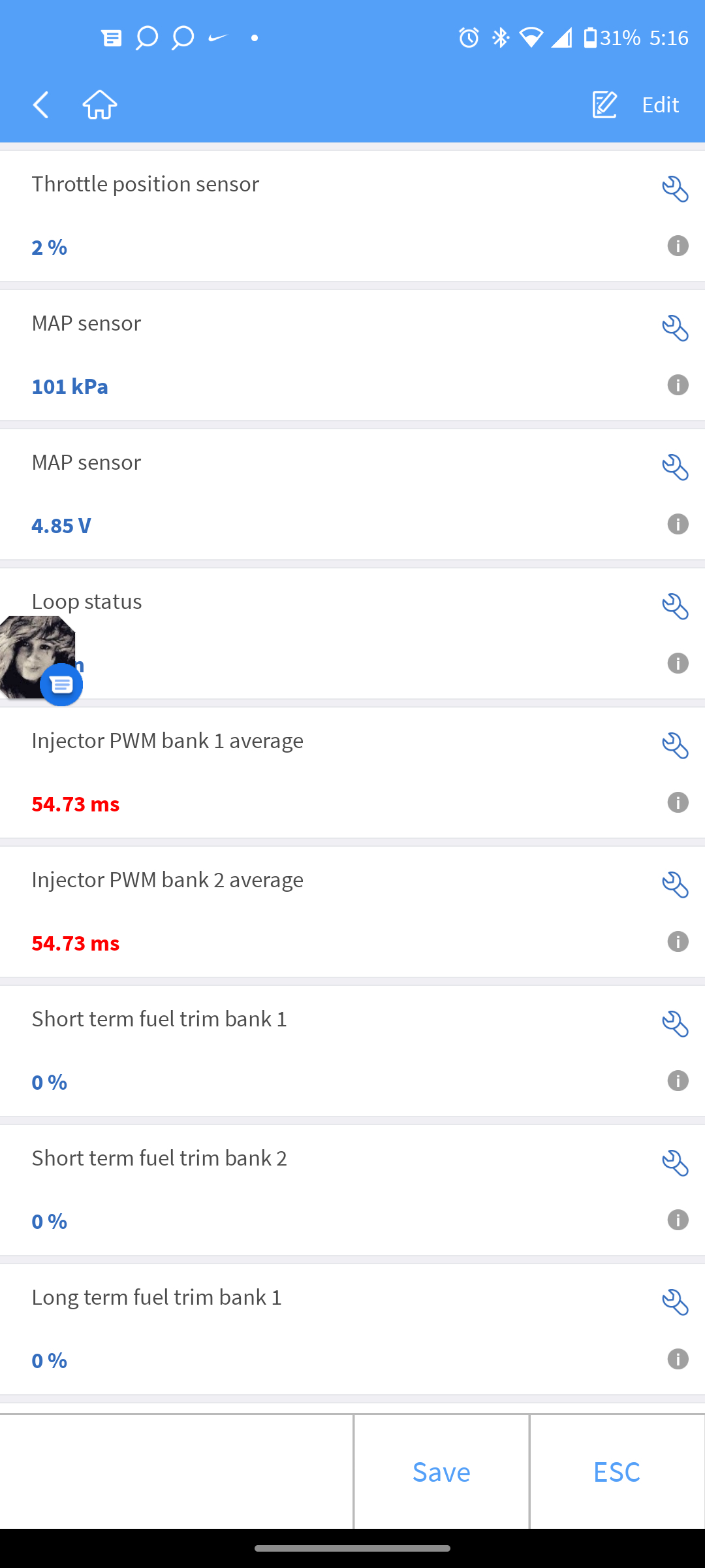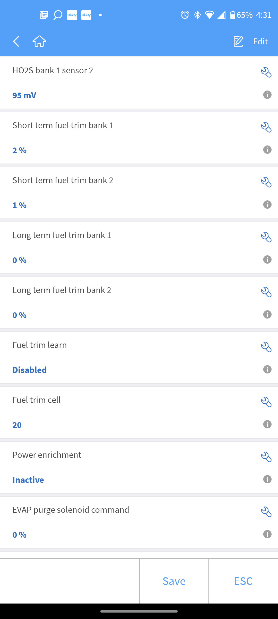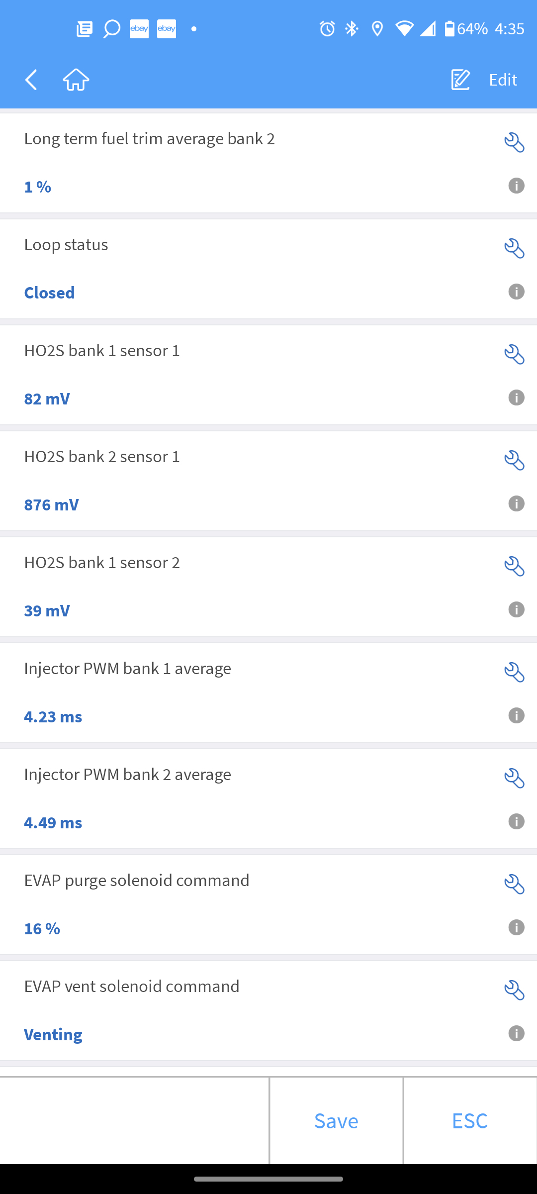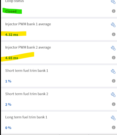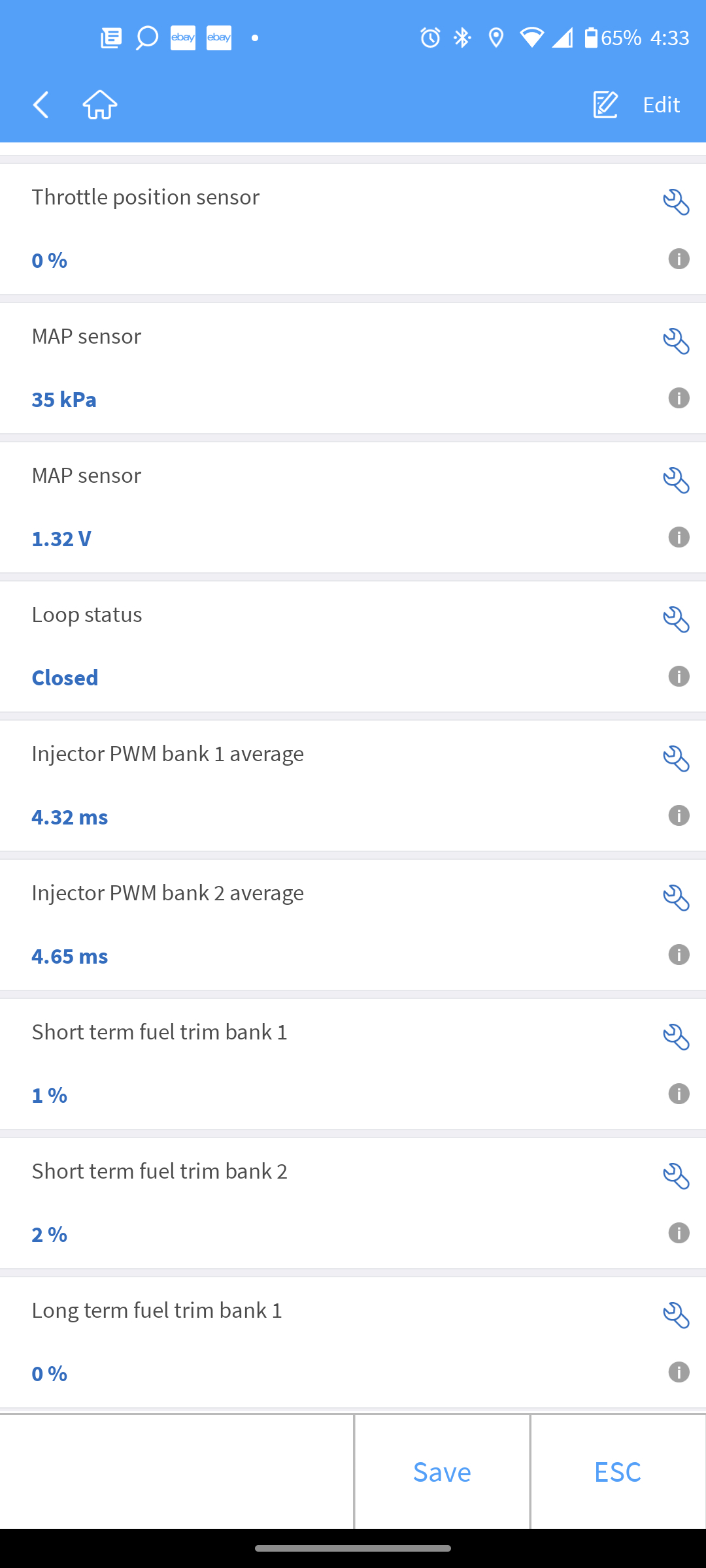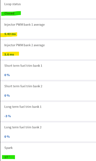 How is this thing running, is it drivable? A couple other things that look odd, Injector pulse is still high, I know this looks like a cold start up too, so it would be a little high due to that, but the pulse width should come down. The Oil Pressure sensor voltage is reading 0 volts, and the Spark advance looks normal at 18 degrees, but the camshaft position is retarded at -4 degrees.