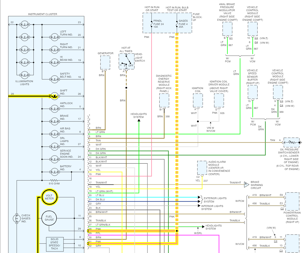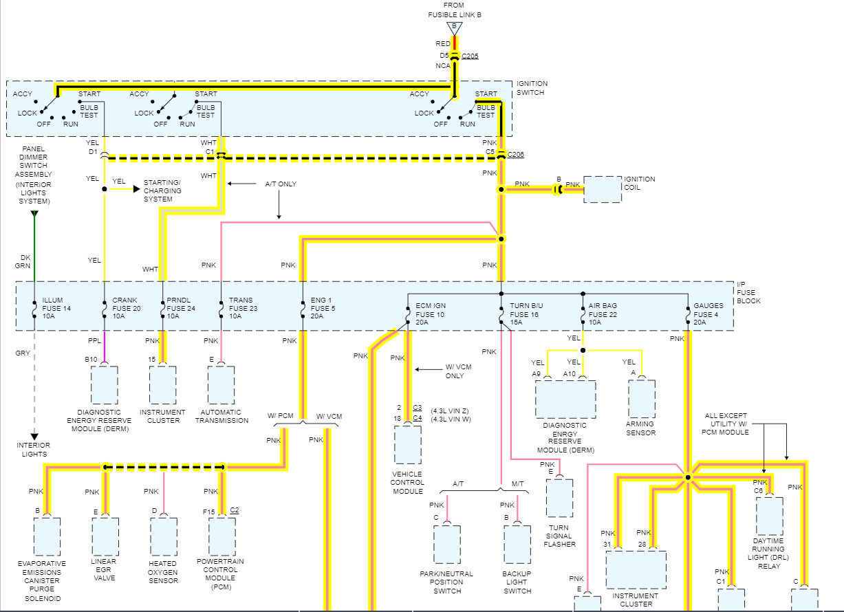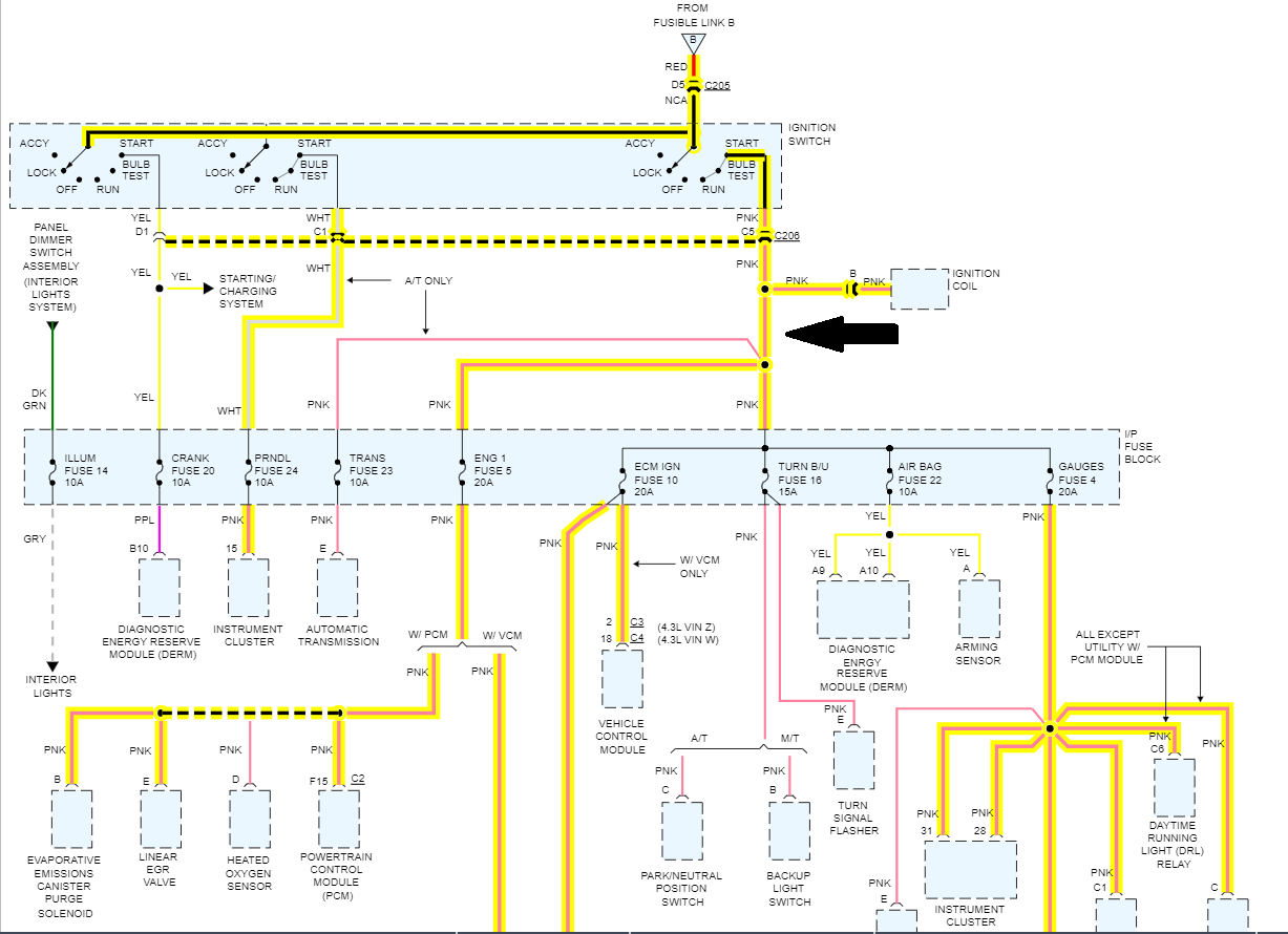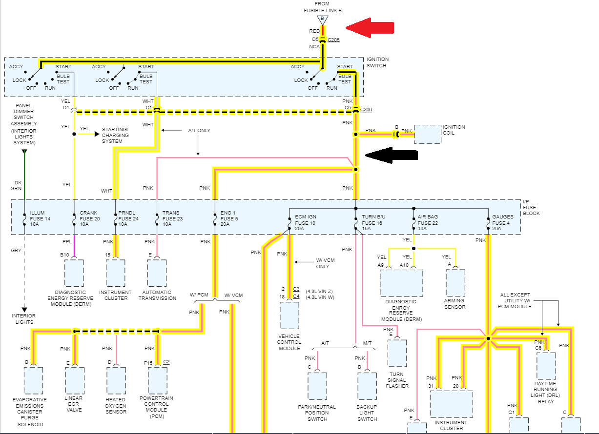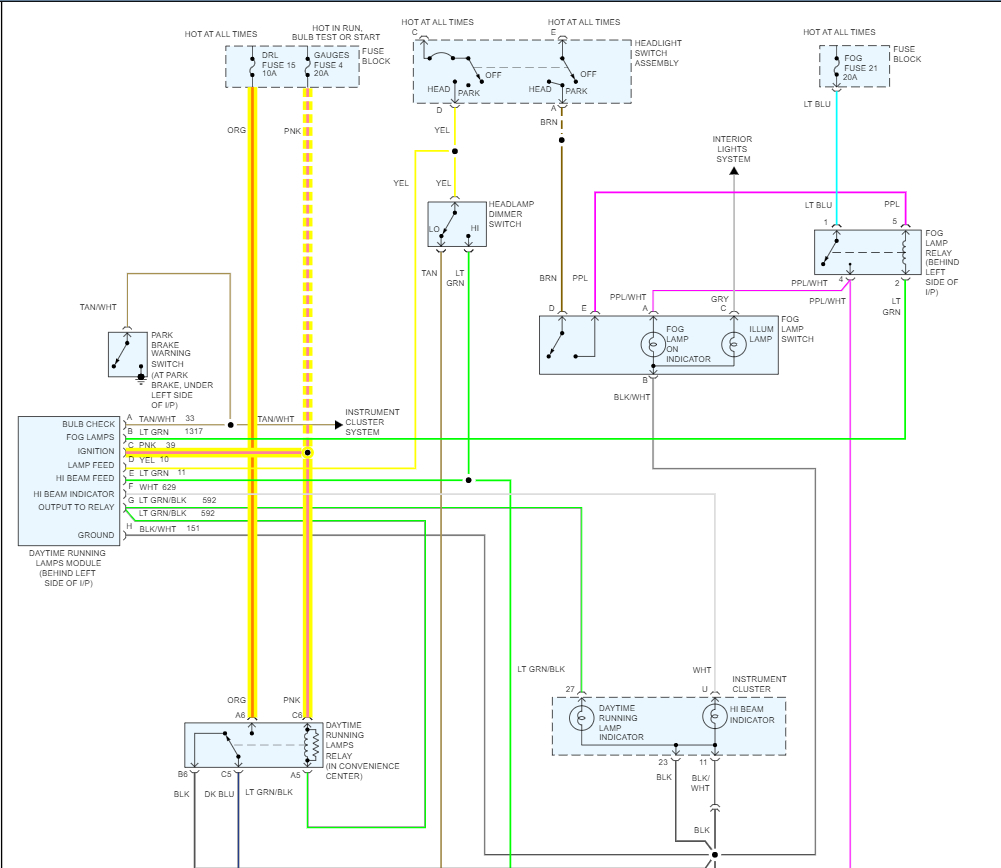 That circuit that I had the arrow to is a pink wire, I checked the OEM diagrams too, there are a lot of pink wires as main feeds to the fuse panel. As for the DRL circuit, there is a relay for the daytime running lights that is power off of the Gauges Fuse 4 20amp circuit. It's the power for the control side of the relay, then the Daytime Running Lamps Module grounds that control side of the relay and that will activate the DRLs. The same circuit branches off and powers up that DRL module too, ill post the diagram below. So that's why the DRLs are not working, there is another possibility here though, On the third diagram, the red arrow comes from a Fusible Link on a junction block, most are on the firewall that come right from the battery. (Diagram 4).