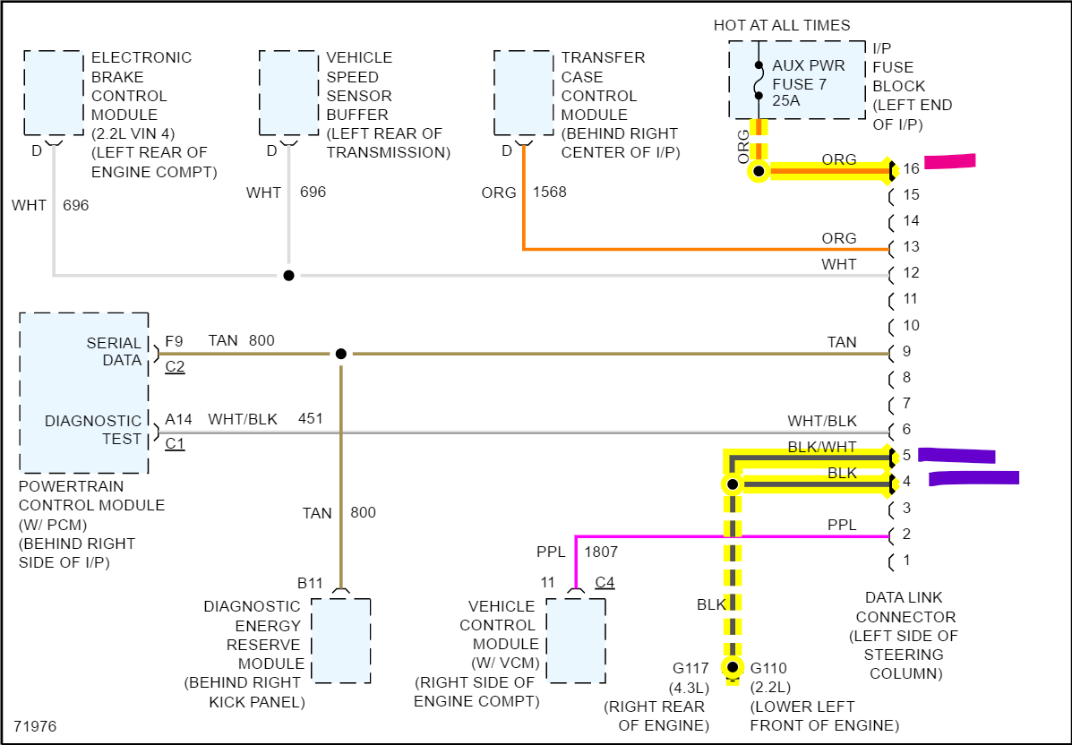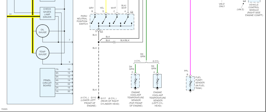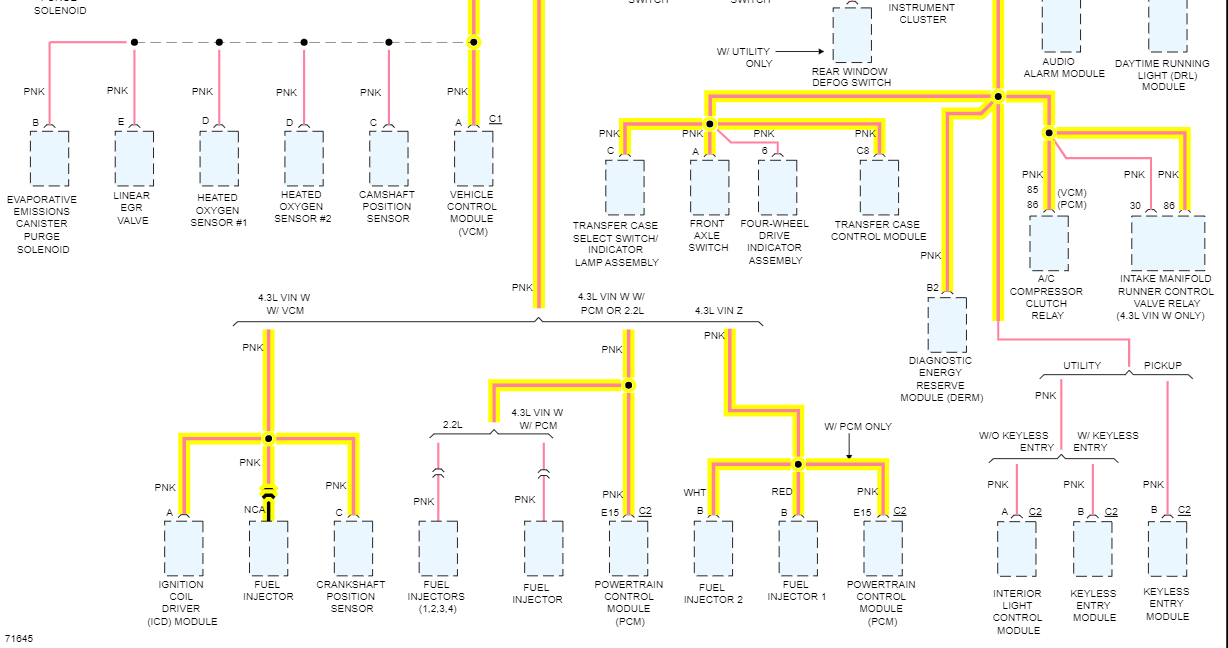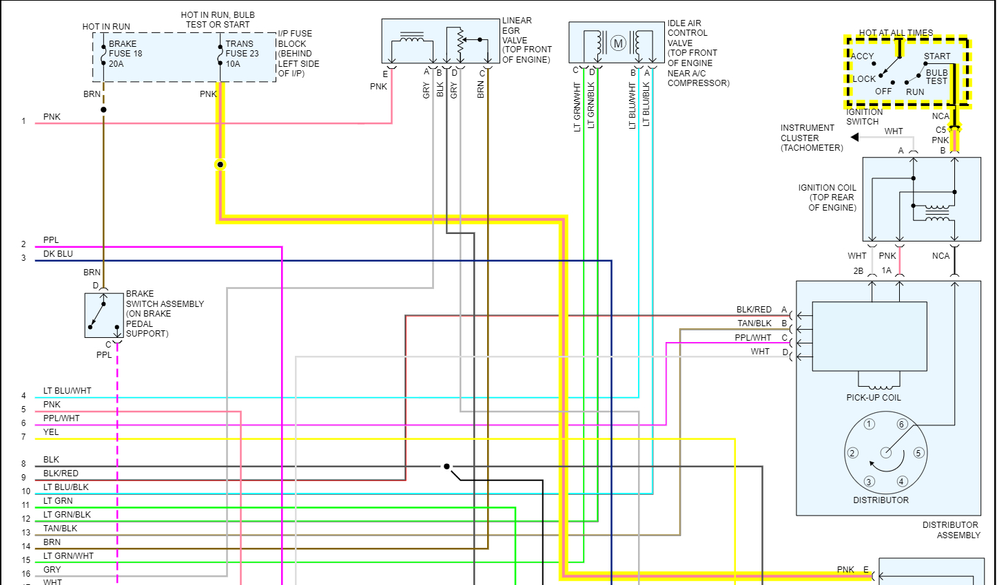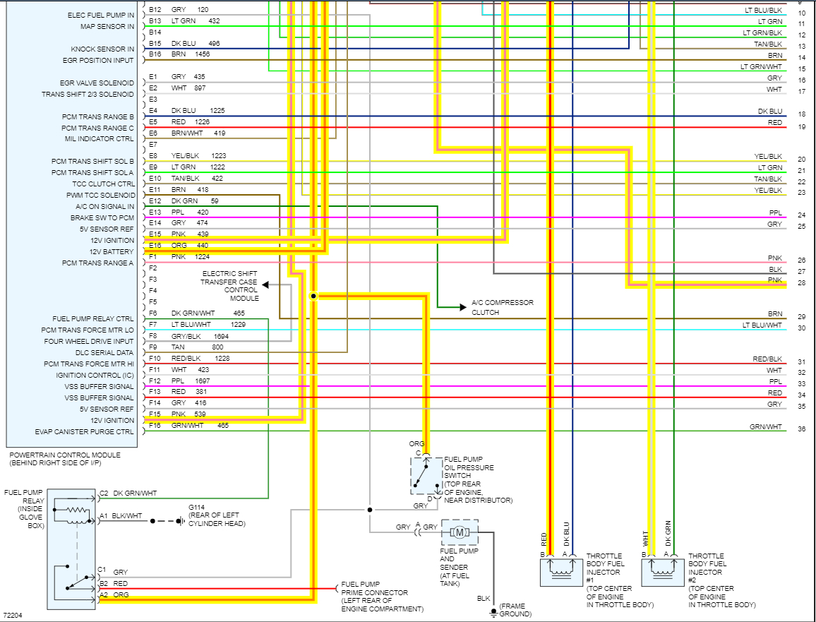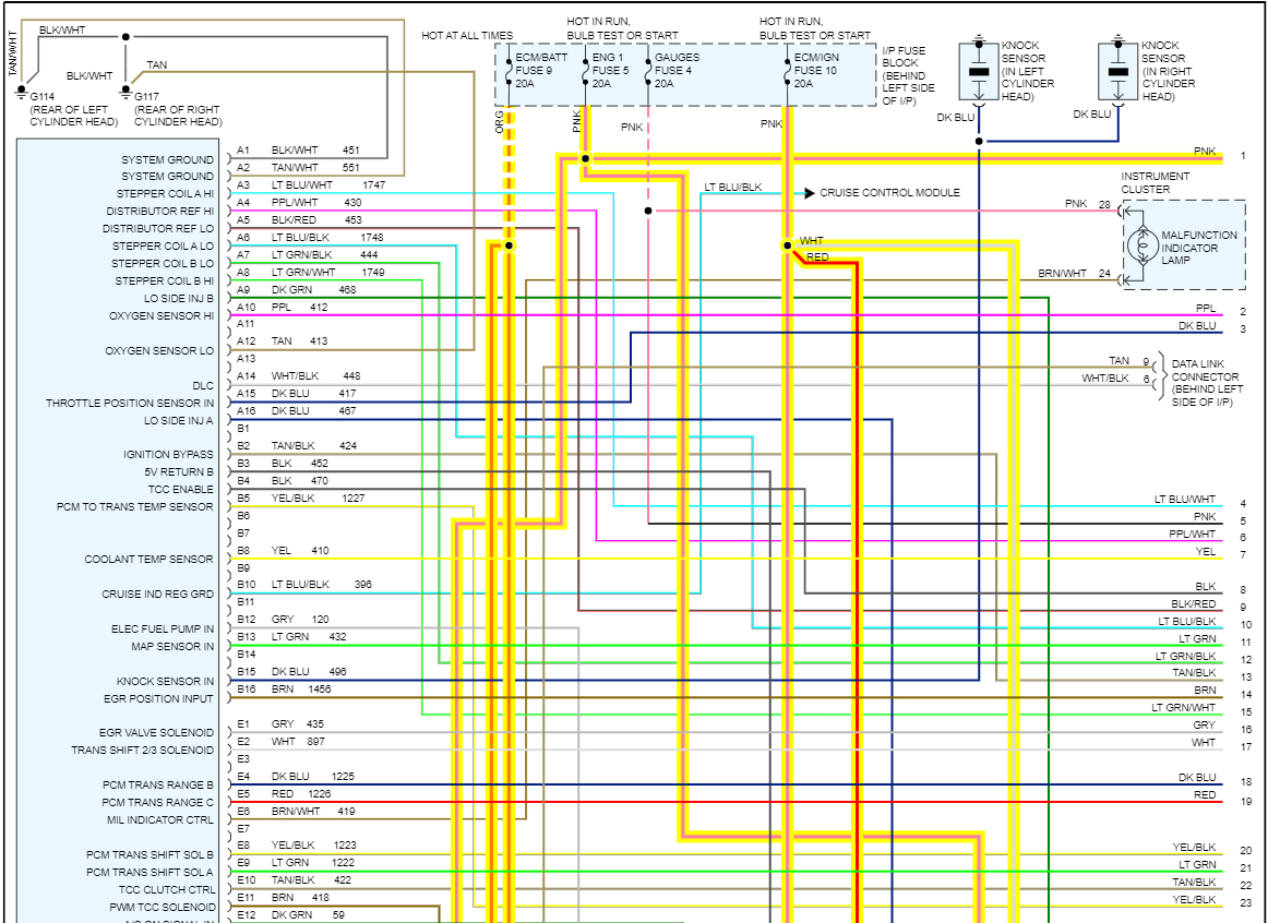 That circuit that I had the arrow to is a pink wire, I checked the OEM diagrams too, there are a lot of pink wires as main feeds to the fuse panel. As for the DRL circuit, there is a relay for the daytime running lights that is power off of the Gauges Fuse 4 20amp circuit. It's the power for the control side of the relay, then the Daytime Running Lamps Module grounds that control side of the relay and that will activate the DRLs. The same circuit branches off and powers up that DRL module too, ill post the diagram below. So that's why the DRLs are not working, there is another possibility here though, On the third diagram, the red arrow comes from a Fusible Link on a junction block, most are on the firewall that come right from the battery. (Diagram 4).