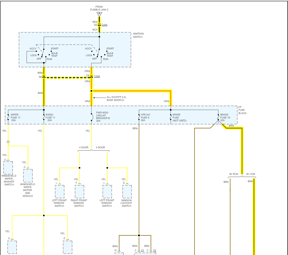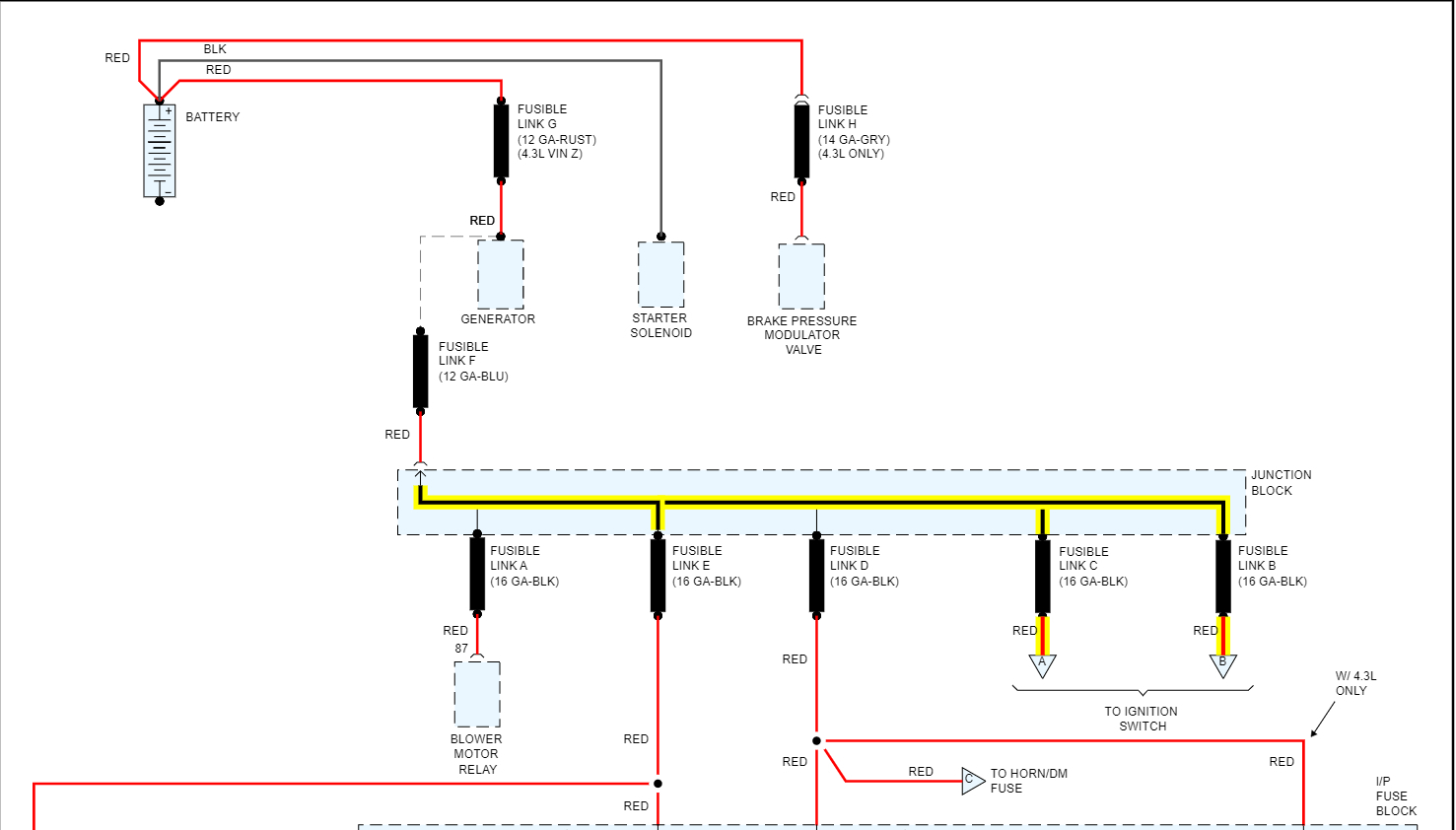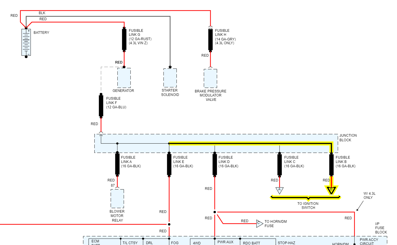 The 16-gauge Fusible Link is rated roughly at 22 amps, but that also depends on how long the circuit is and the resistance in the circuit. That Fusible Link is what is feeding the circuits that are down right now through the Ignition Switch.