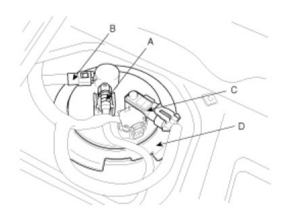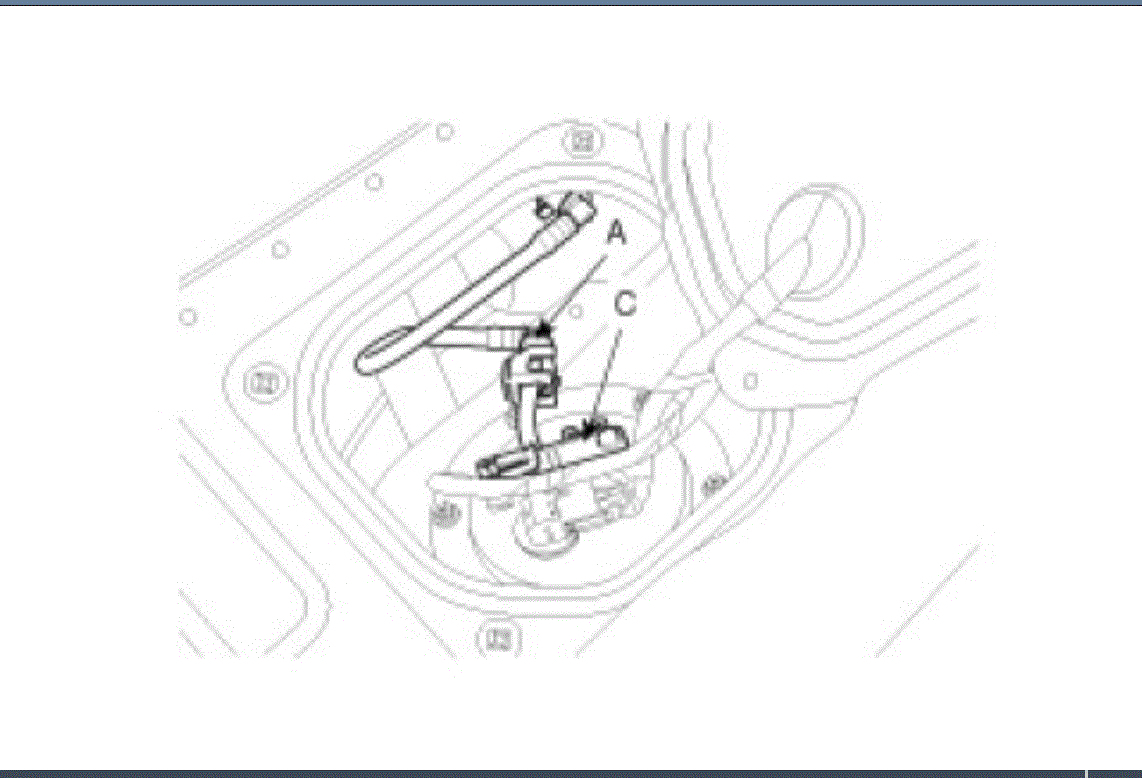 2. Disconnect the Fuel Feed Line (A), Recirculation Line (B) and Fuel Tank Pressure Sensor connector (C).