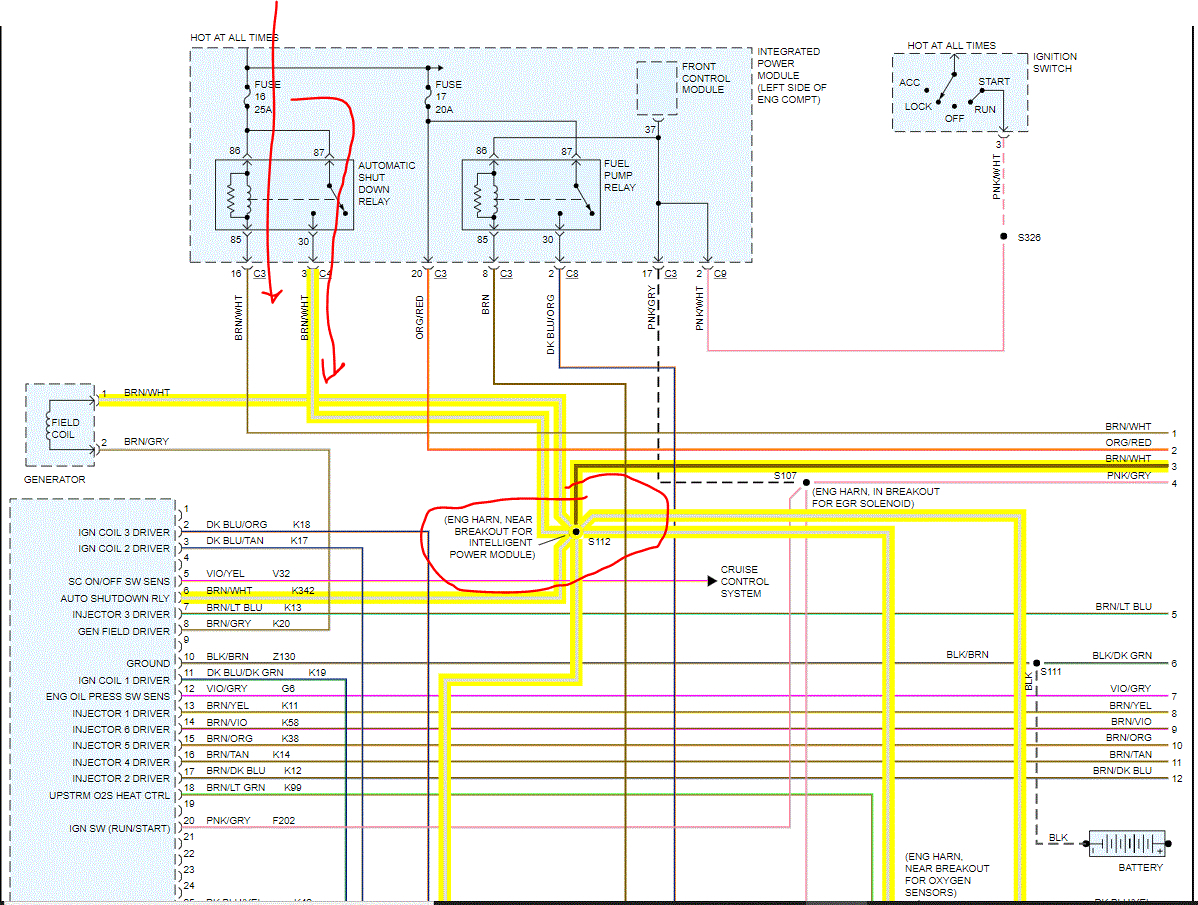 See pics below. Note: I had to cut each page of the schematic in half to make them readable for you. I did overlap them so you can follow from one to the next. I highlighted and wiring involved. Note that the splice sends power to several different components (S112) which is near the IPD module under the hood.
