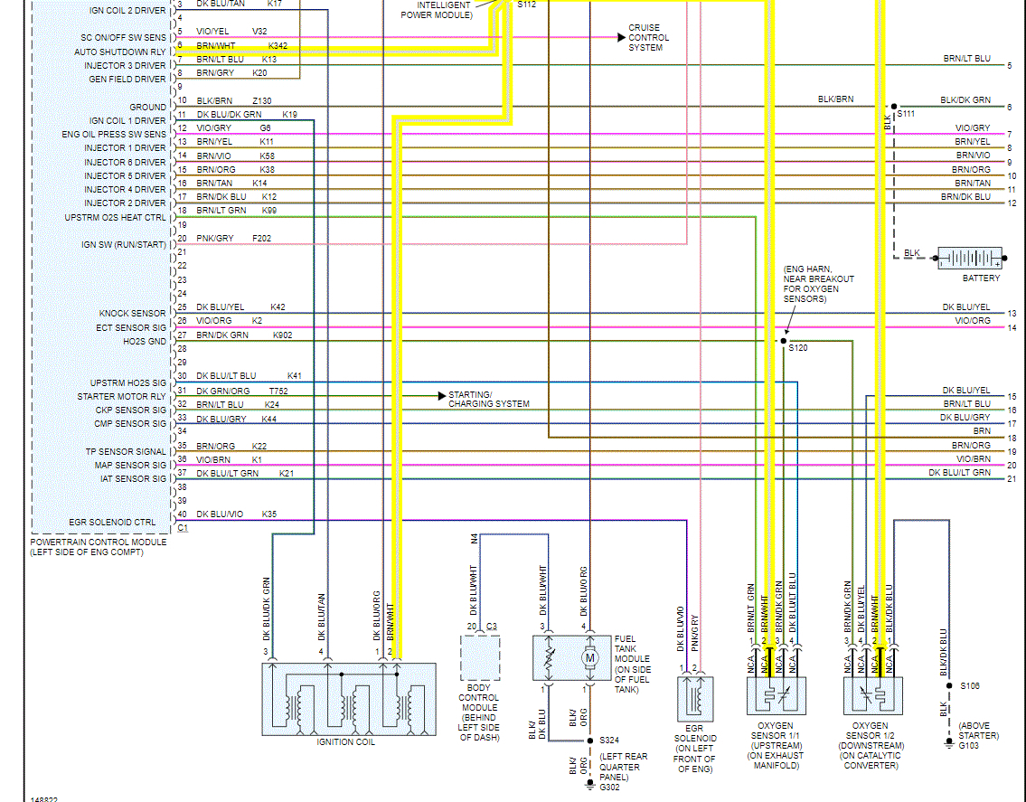 When the key is in the ON position and the engine is not running (zero rpm), the Auto Shutdown (ASD) and fuel pump relays de-energize after approximately 1 second. Therefore, battery voltage is not supplied to the fuel pump, ignition coil, fuel injectors, and heated oxygen sensors. So, if you have spark, the sensors should be working. That leaves a wiring problem or a PCM problem.