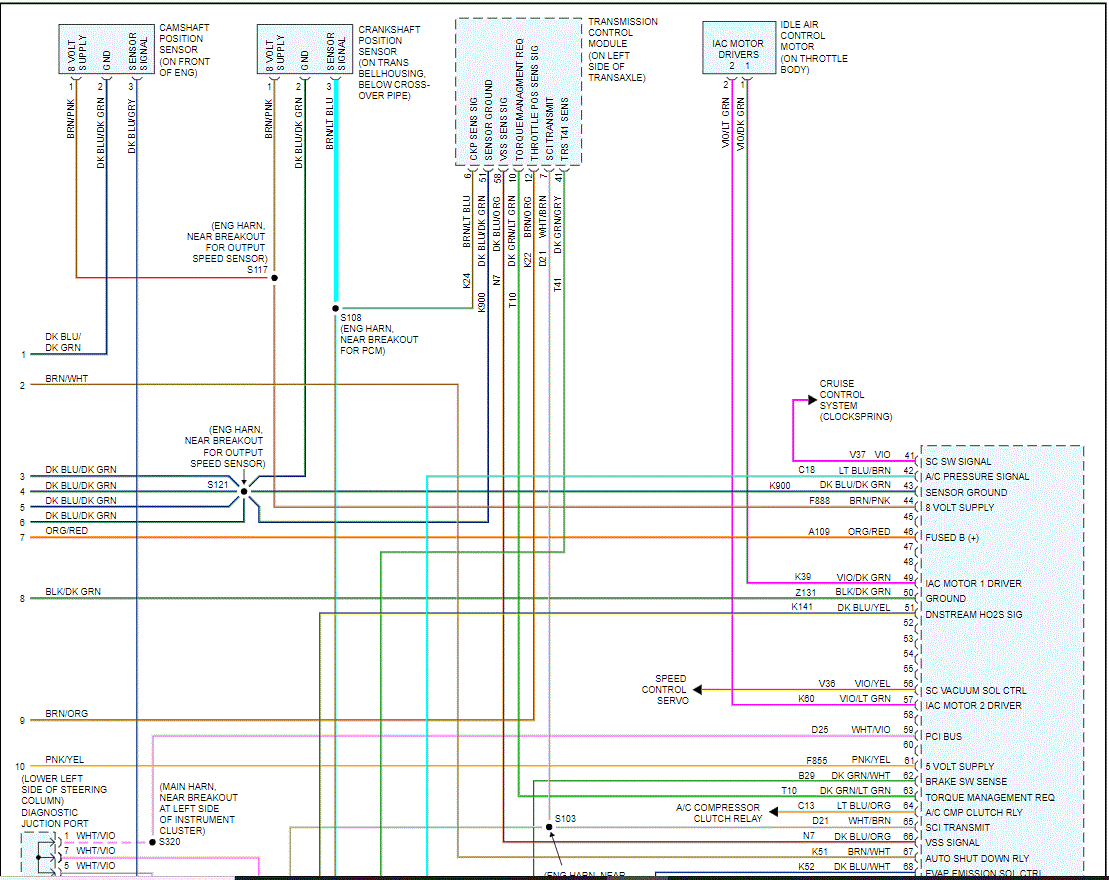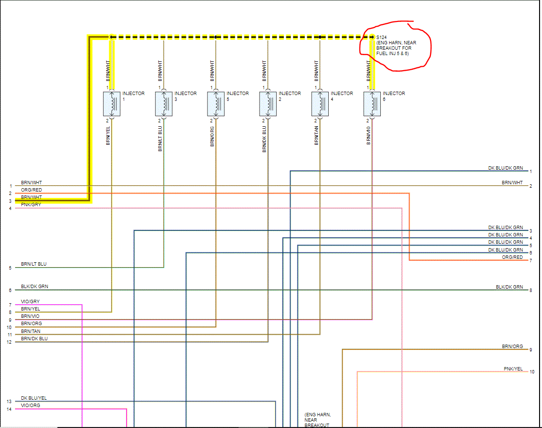 I attached the wiring schematic below for the entire powertrain management system. I need you to locate the brown wire with a white tracer at each injector. There is a wire splice near the breakout for injectors 5 and 6. Inspect that splice for corrosion or damage.