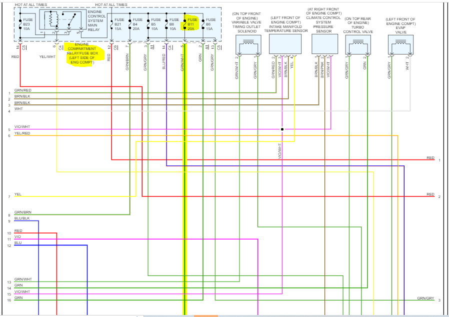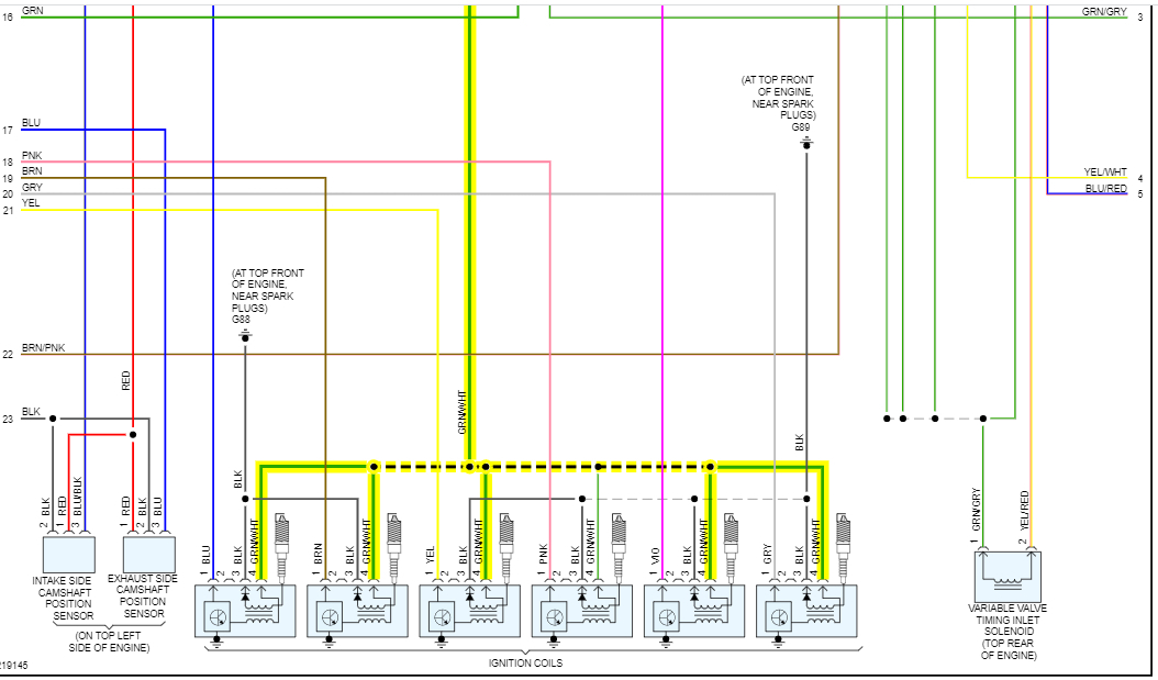 Do you have power to the aforementioned (green/white) wires at the coils? If you do, we need to check for a ground path via the ECM on the brown, yellow, pink, and violet wire on the coil pack. Here is how to do it: