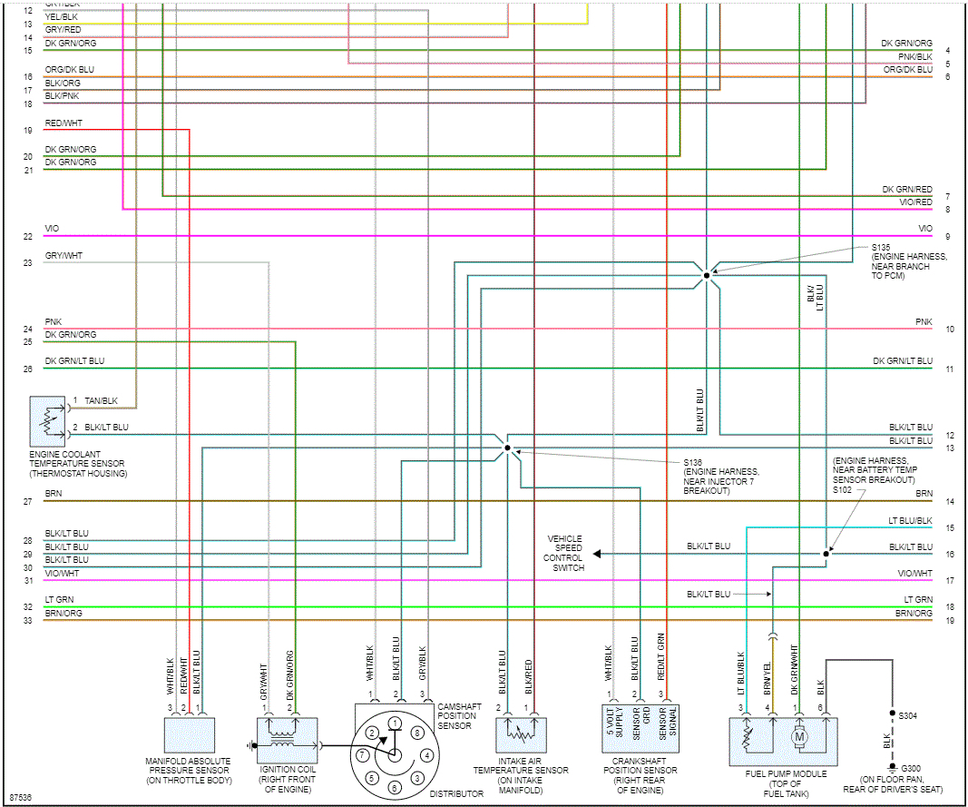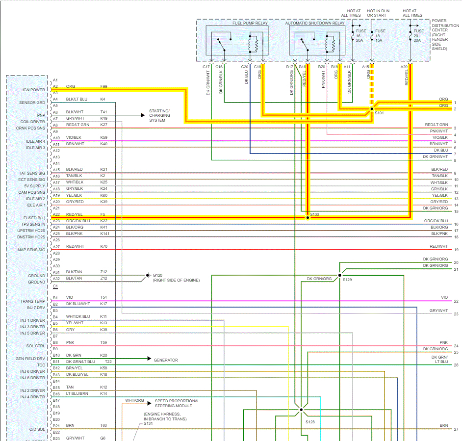 I attached the entire wiring schematic below for the powertrain management circuit. I highlighted the ASD relay and the fuses. First, confirm the fuses are good and have power to them. Here is a link to help: