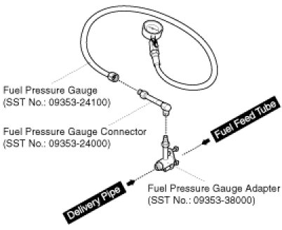(2)Install the special service tool for measuring the fuel pressure in between the fuel feed tube and the fuel delivery pipe .