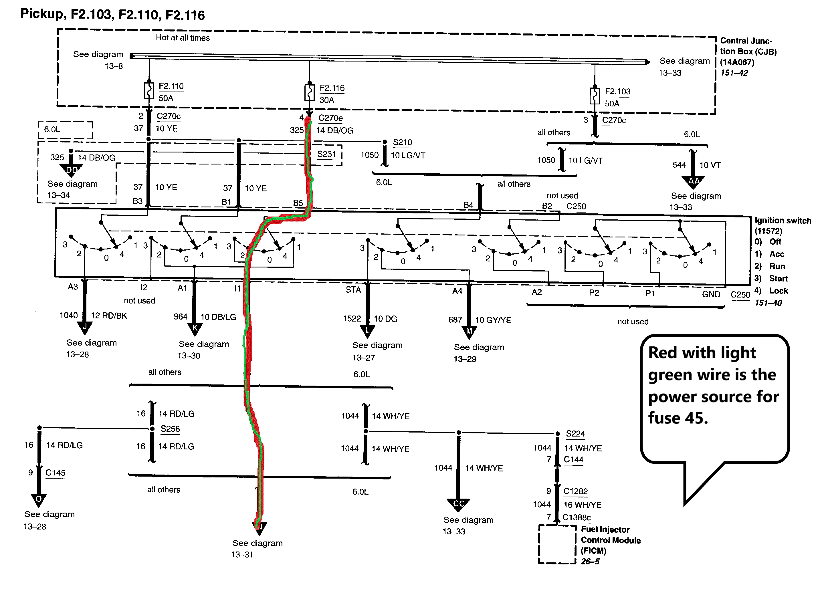 It cranks fine. I am not getting power on fuse number 30 and fuse number 45 when I'm supposed to have power. I am not getting power on the fuses. I would like to know where you could hook into within wires? I need a wiring schematic.