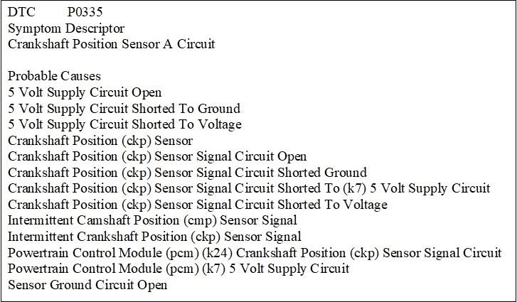 This chart lists the things that could cause code 335 to set. The best place to start is by watching the signal on a scanner under "live sensor data". You should see it switch from "No" to "Present", or something similar, when the crankshaft is rotating, (cranking or running). If it stays on "No" while you're cranking the engine, we have to look at this chart to find the cause. We know it's not the sensor at this point.