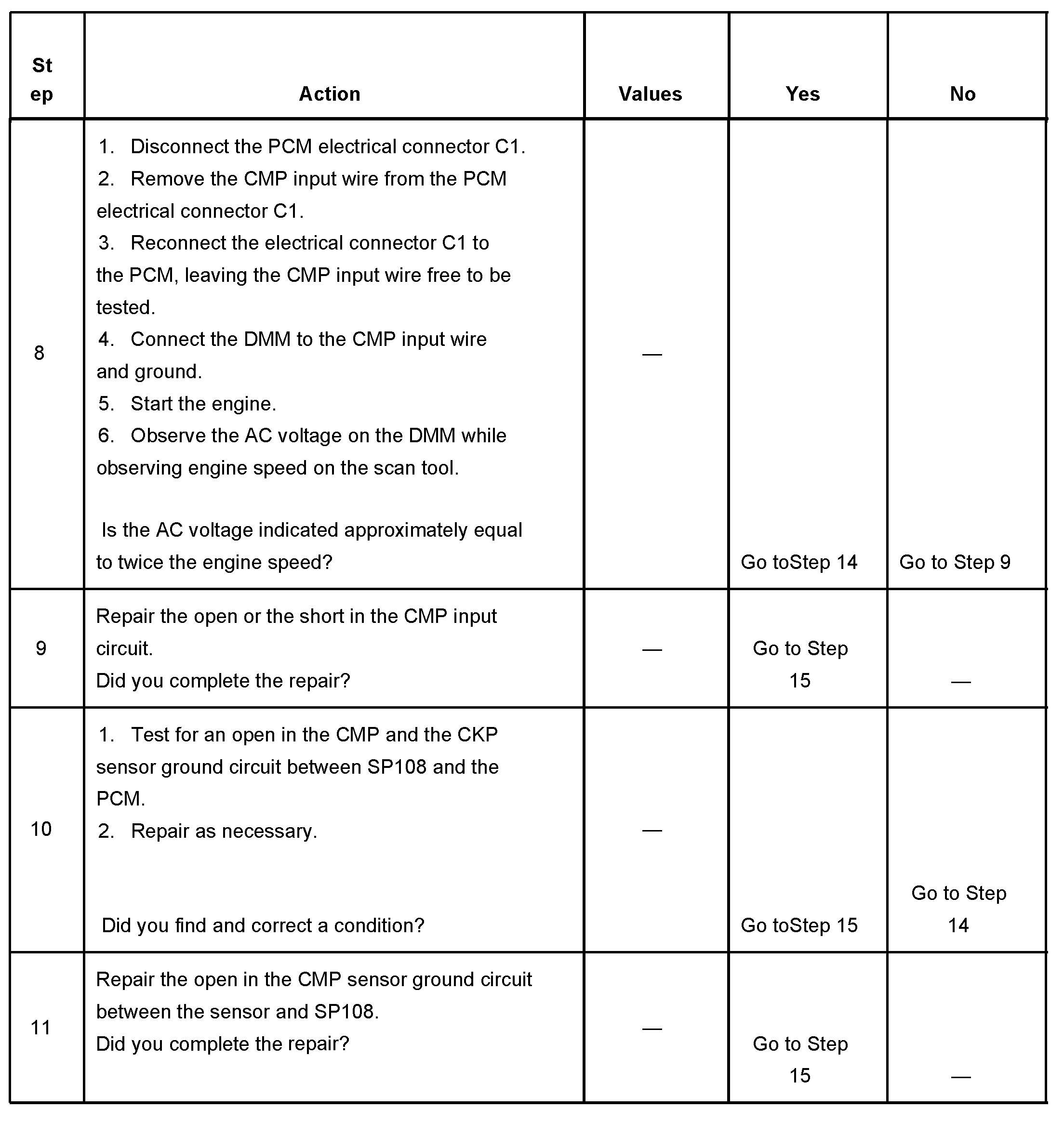 8. This step tests the camshaft position (CMP) sensor input circuit to the PCM. The AC signal generated by the CMP sensor will be numerically analogous to the engine speed. With the engine speed at about 1,200 RPM, the CMP sensor voltage should be around 2.450-2.550 volts AC. The CMP sensor signal wire must be removed from the PCM connector in order to accurately check the sensor output. If the CMP sensor signal wire is backprobed while connected to the PCM, the AC voltage indicated on a DMM will be approximately 15-20 percent lower than the actual engine speed.