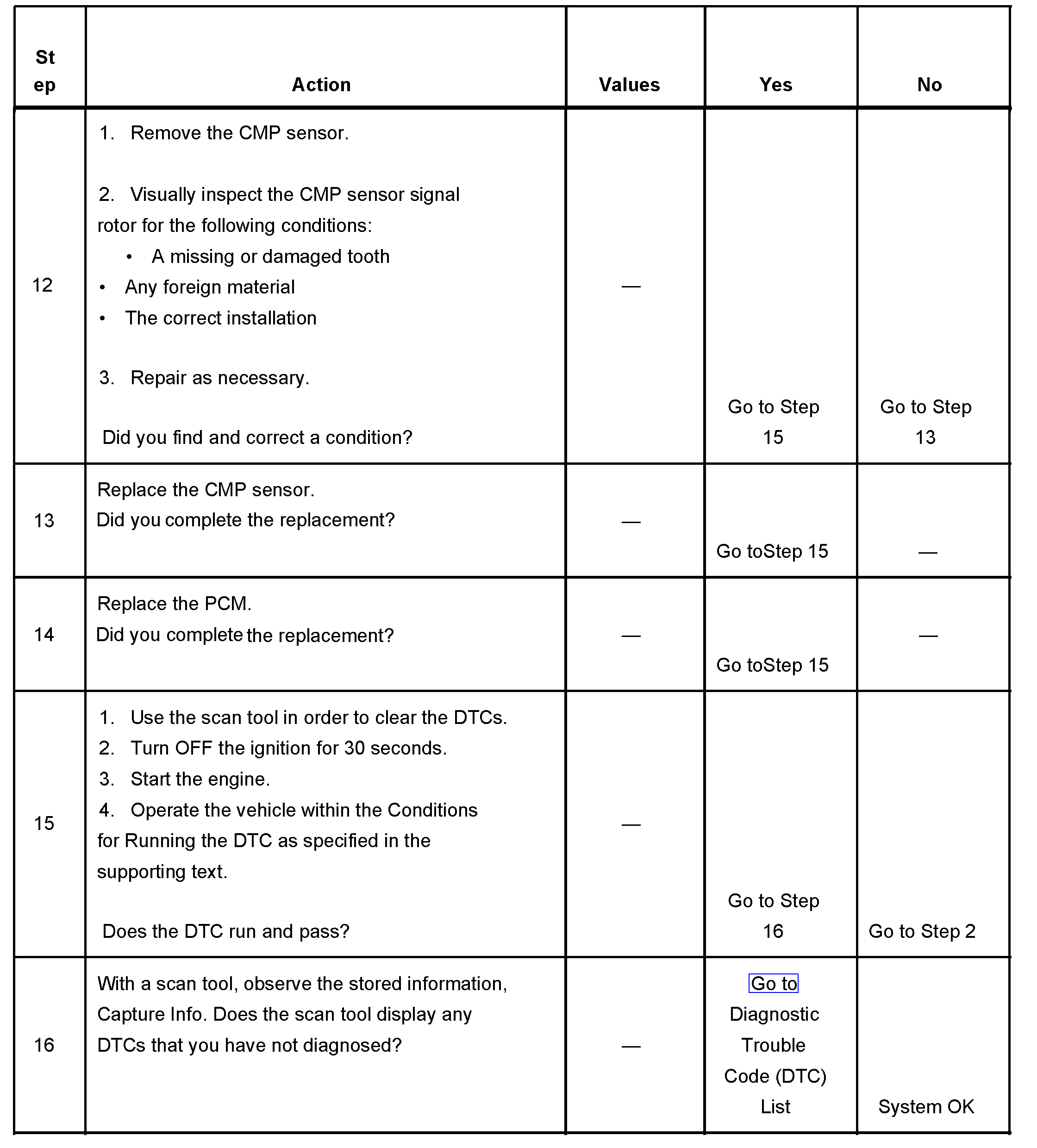 12. This step inspects for a faulty signal rotor on the camshaft. Visually inspect the tooth of the signal rotor through the CMP sensor aperture for damage, foreign material, and installation.