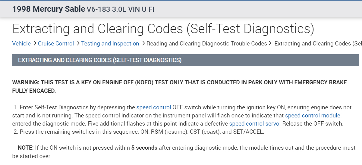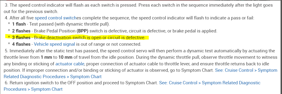 I bought this car used and the cruise control does not seem to work. I was reading on the self-diagnostic test on the same make and model as my car listed above and everything flashed once cruise and then on the last one it flashed three times. So, what does that mean and what is my next step to fixing the cruise control?