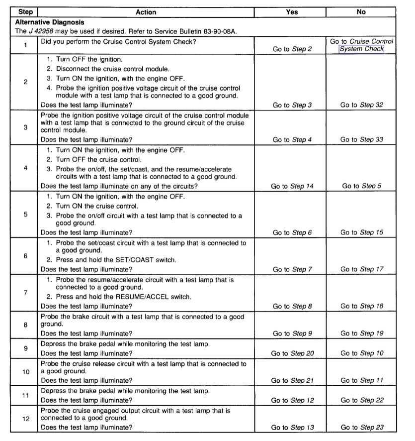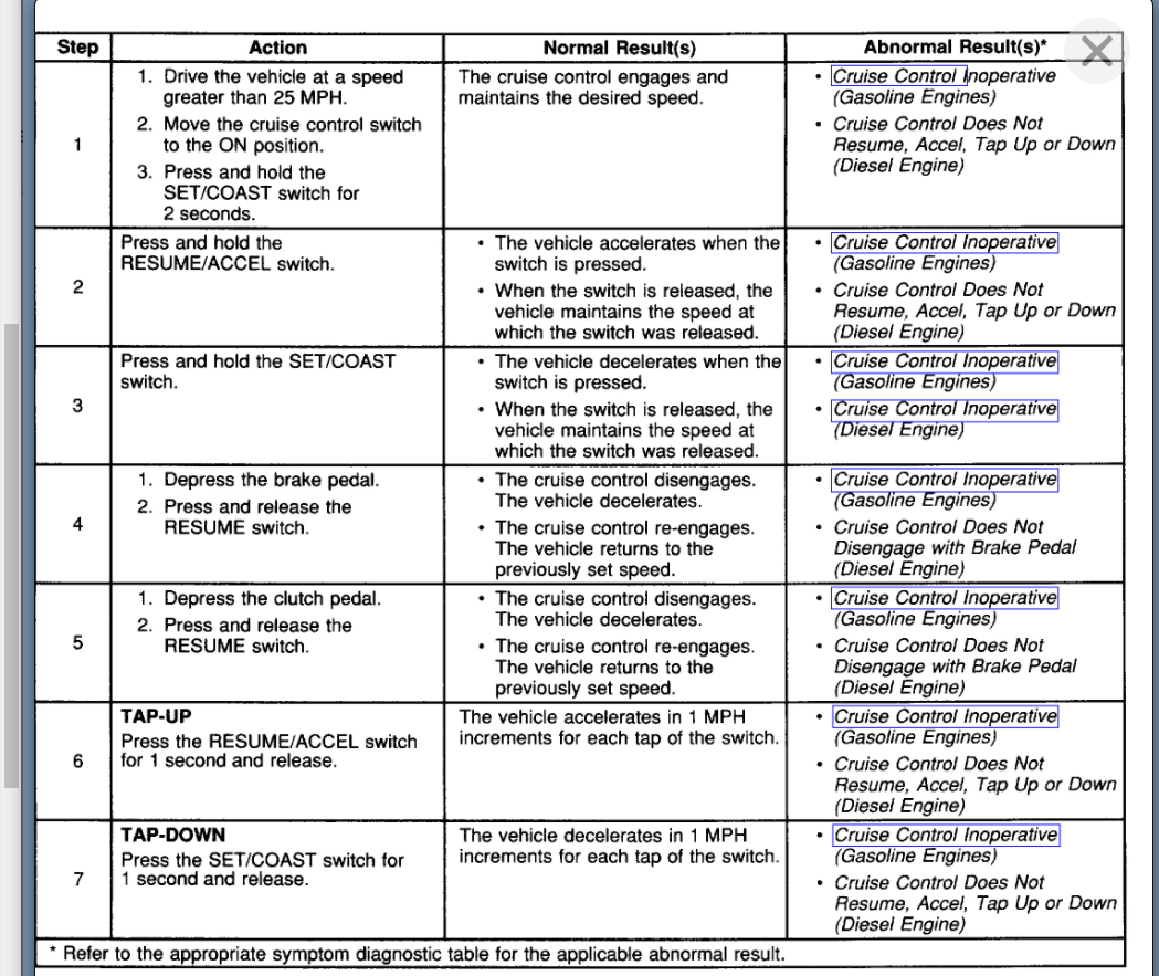 Basically the way this works is you press the switch and it tells the cruise module to turn on the system and the light on in the dash. Then when you press the set button it needs to see no brake switch input and vehicle speed about 25 MPH (I think).