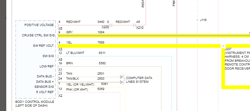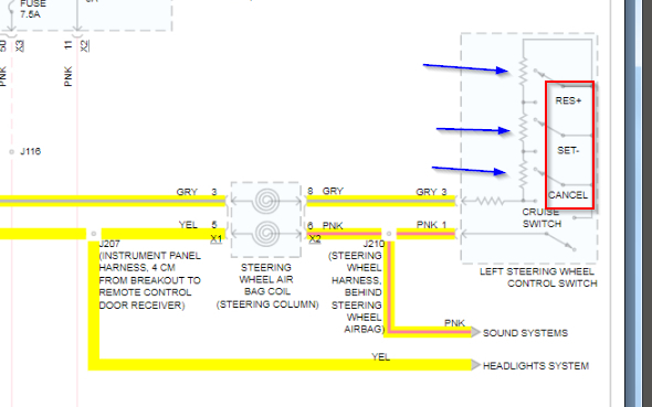 If you look at what the blue arrows I added are pointing too, those are resistors in the switch. This tells us that when the cancel button is pressed it grounds the signal wire and then BCM sees a voltage signal. When one of the other buttons are pressed, it grounds the signal wire but the voltage passes through other resistors and it changes the voltage the BCM sees so it knows that a different button has been pressed.