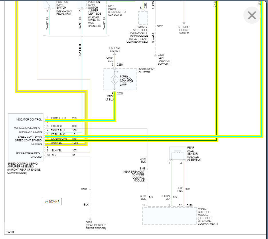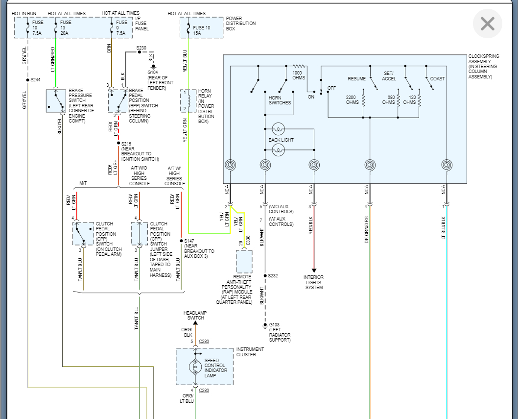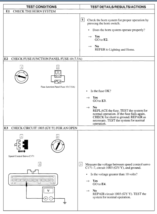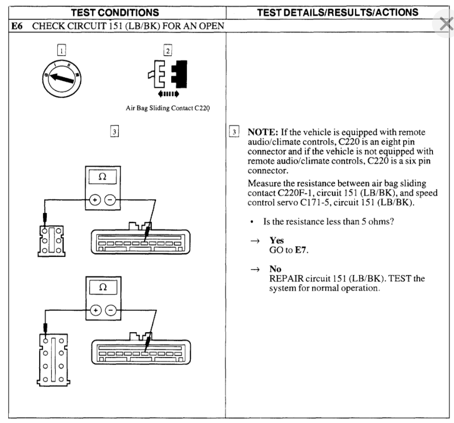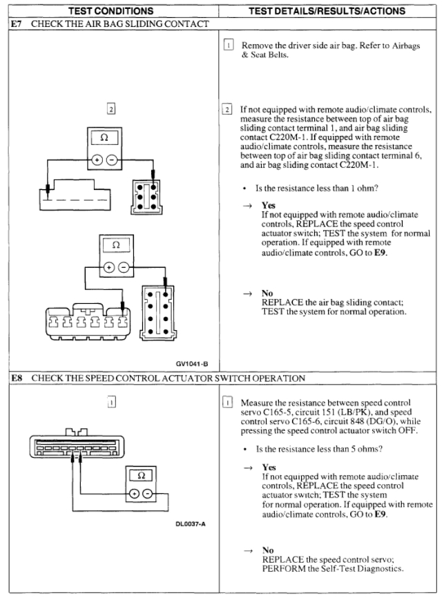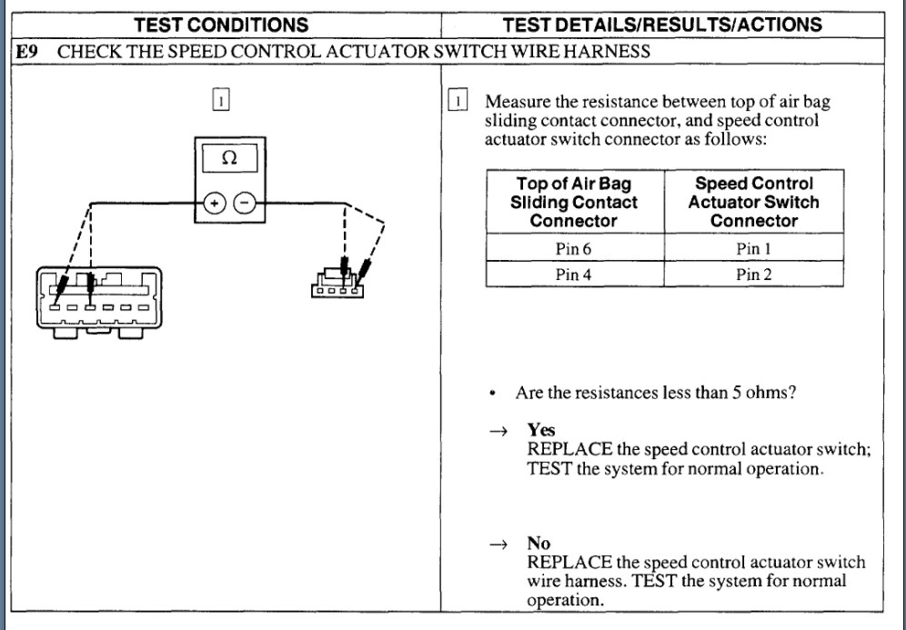 The same thing with the deactivation switch. When this fails, it thinks the system needs to be turned off and so it won't allow you to activate it. This can be tested by just unplugging the sensor and jumping the switch terminals in the connector to see if the cruise comes on.
