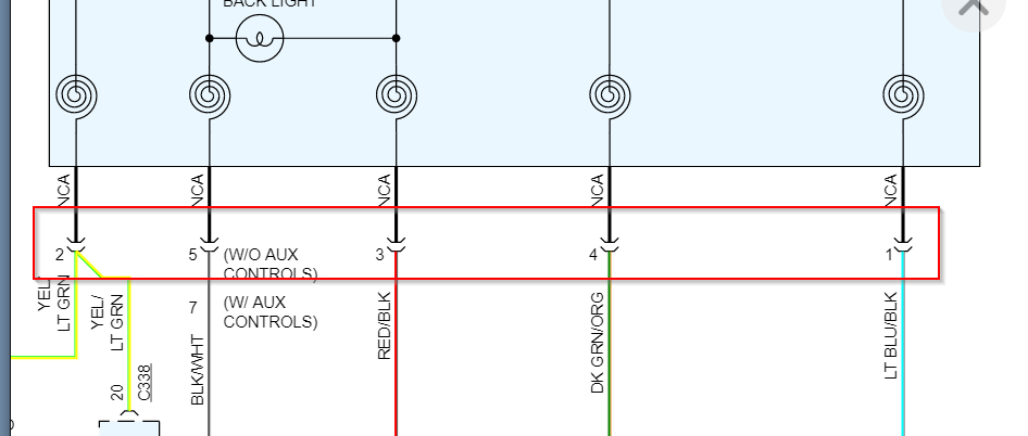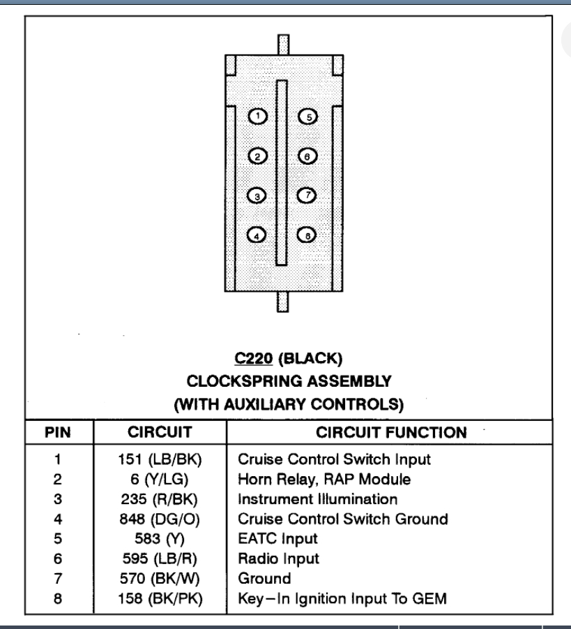 I am attaching the process on how to replace the clock spring. You will see the connector in this process. Also, the connector view depending on if you have aux controls or not. However, both connectors have this circuit in pin 1.