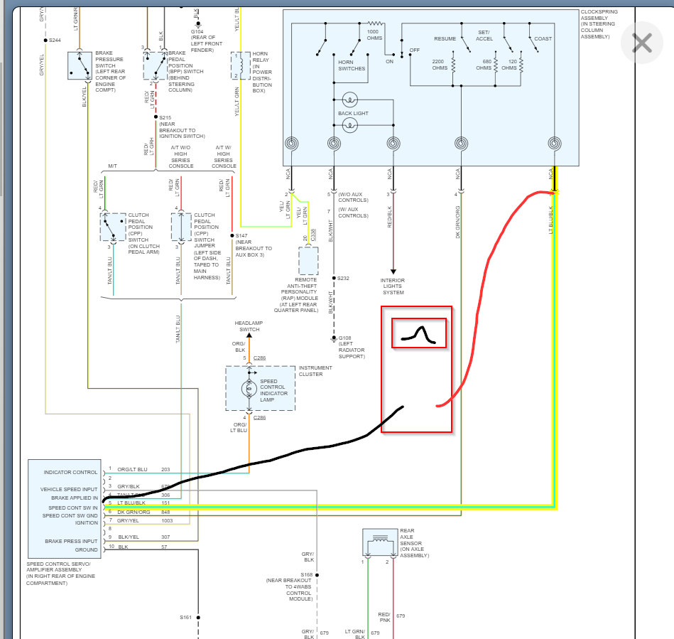 To try and illustrate this, using words the circuit starts at the switch on the steering wheel. When you press the button, it sends voltage down through the clock spring to the c220 connector where the LB/BK wire takes that voltage to the servo. What you are testing is the wire that leads to the servo to find out if that is the source of the high resistance. If it is not, then the clock spring would be the issue.
