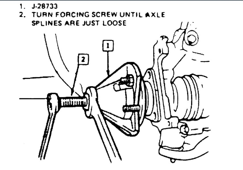 6. Remove drive axle from hub and bearing assembly using front hub spindle remover tool No. J-28733-A, or equivalent, Fig. 8 .