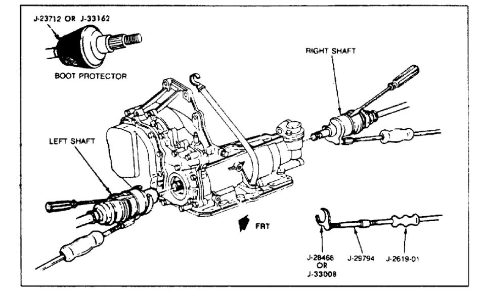 7. Remove drive axle from transaxle using axle shaft remover puller tool Nos. J-33008, J-29794 and slide hammer tool No. J-2619-01, or equivalents, if necessary, Fig. 9 .