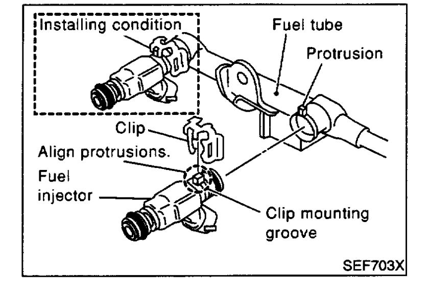 - Make sure that protrusions of fuel injectors are aligned with cutouts of clips after installation.