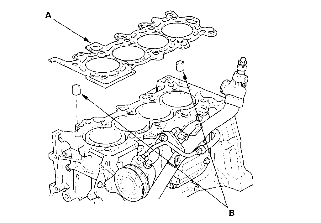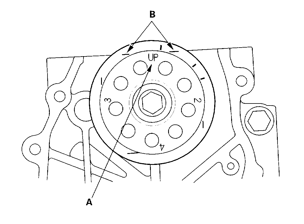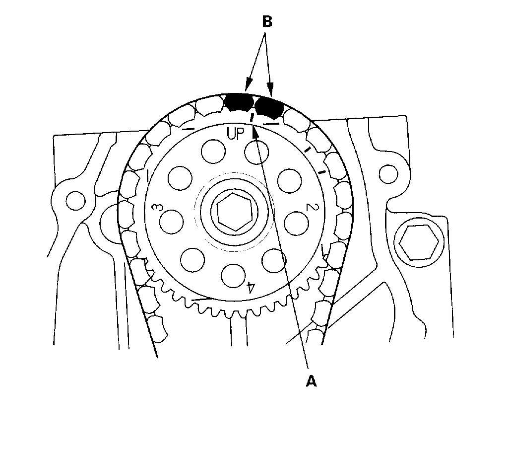 2. Set the No. 1 piston at TDC. The "UP" mark (A) on the camshaft sprocket should be at the top, and the TDC grooves (B) on the camshaft sprocket should line up with the top edge of the head.