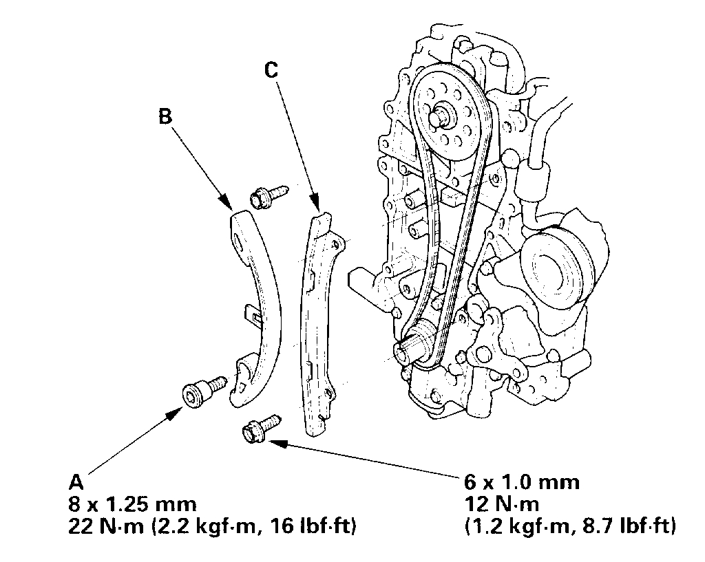 6. Install the cam chain tensioner rail (B) and cam chain guide (C).
