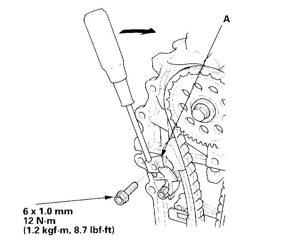 9. Turn the cam chain tensioner clockwise to compress the cam chain tensioner rail. Install the remaining bolt, then tighten the bolts.