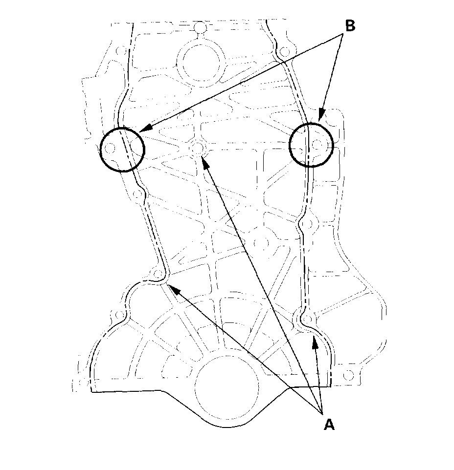 Apply a 3.0 mm wide bead of liquid gasket to the cylinder block upper surface contact areas (B) on the chain case.