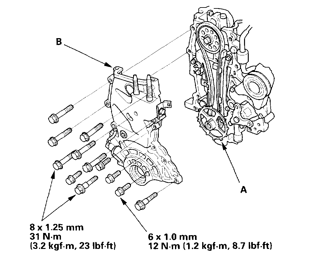 1. Set the crankshaft to top dead center (TDC). Align the TDC mark (A) on the crankshaft sprocket with the pointer (B) on the oil pump.