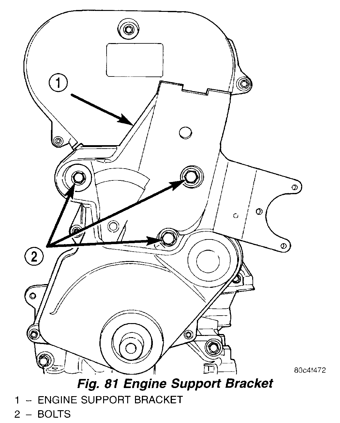 9. Install right engine support bracket. Ensure the power steering pump is properly located in mounting location on bracket. Tighten mount bracket bolts to 61 Nm (45 ft. Lbs.) (Fig. 81).