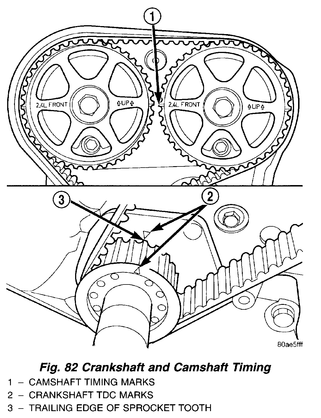 6. Once the timing belt has been installed and tensioner released, rotate the crankshaft two (2) complete revolutions. Verify that the TDC marks on crankshaft and timing marks on the camshafts are aligned as shown in (Fig. 86).