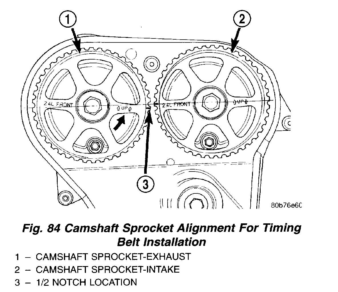 2. Set camshafts timing marks so that the exhaust camshaft sprocket is a 1/2 notch below the intake camshaft sprocket (Fig. 84).