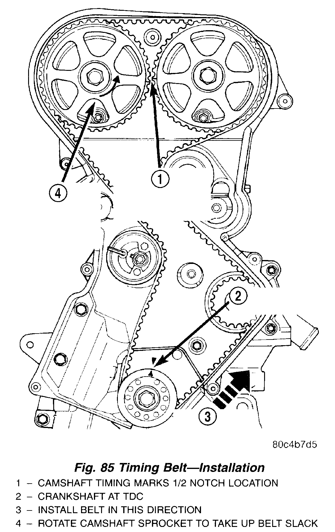 4. Move the exhaust camshaft sprocket counterclockwise (Fig. 85) to align marks and take up belt slack.