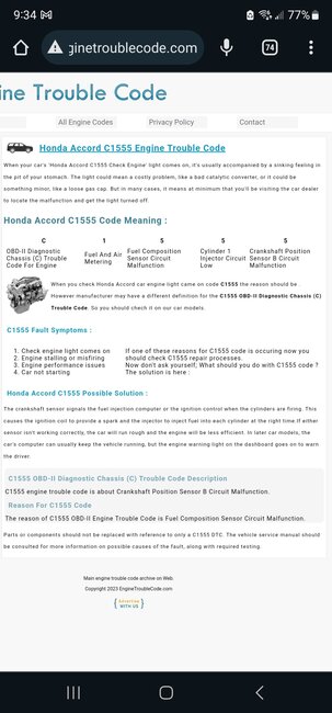 This vehicle does have a Steering Angle Sensor which is part of the VSA system which incorporates the ABS, Electronic Brake Distribution, Traction control, Vehicle Stability Assist (VSA) and Brake Assist components. So, if turning the steering wheel sets this code, it might be something to do with the Steering angle sensor. Sometimes they need to be recalibrated with a capable scan tool. The scan tool would need to be able to communicate with the VSA module to calibrate all the sensors. There are multiple sensors along with the Steering angle, such as the Yaw Rate-lateral acceleration sensor which is an input for the actual angle of tilt the vehicle makes when turning, even though it is such a small amount, these sensors are very sensitive. The wheel speed sensors which input to the ABS module. I'm going to look at some other locations for any information on the C1555, because I don't think it has anything to do with the crankshaft sensor or injector wiring.
